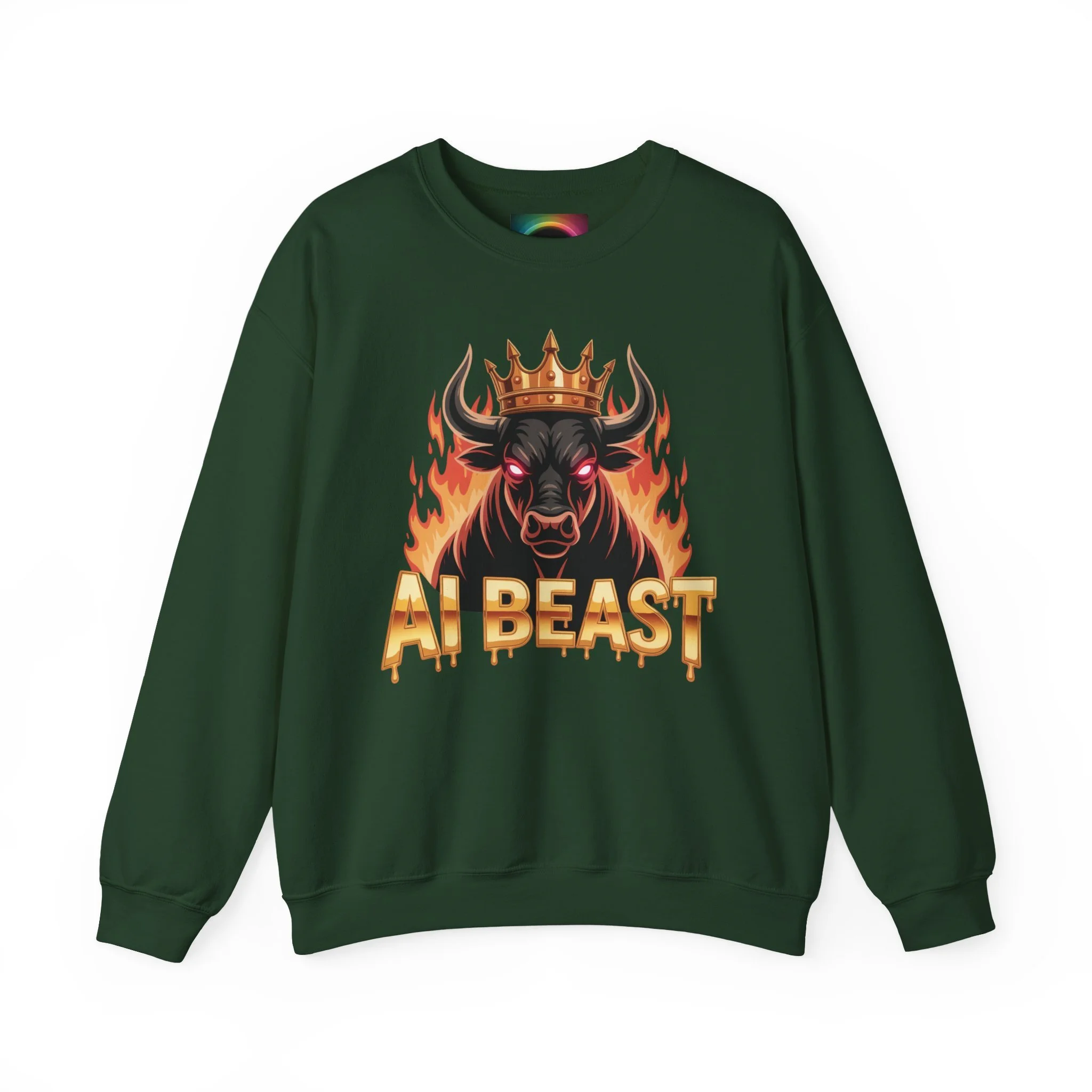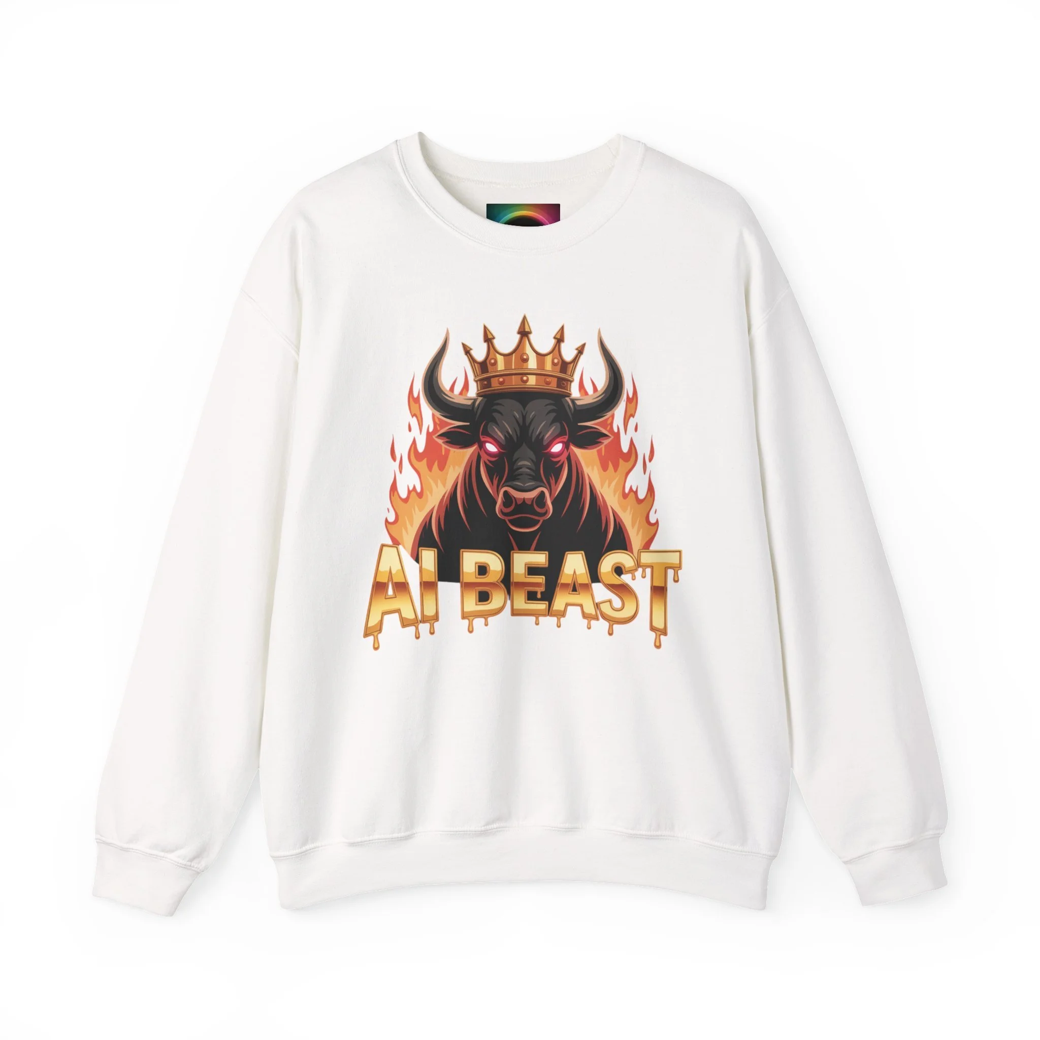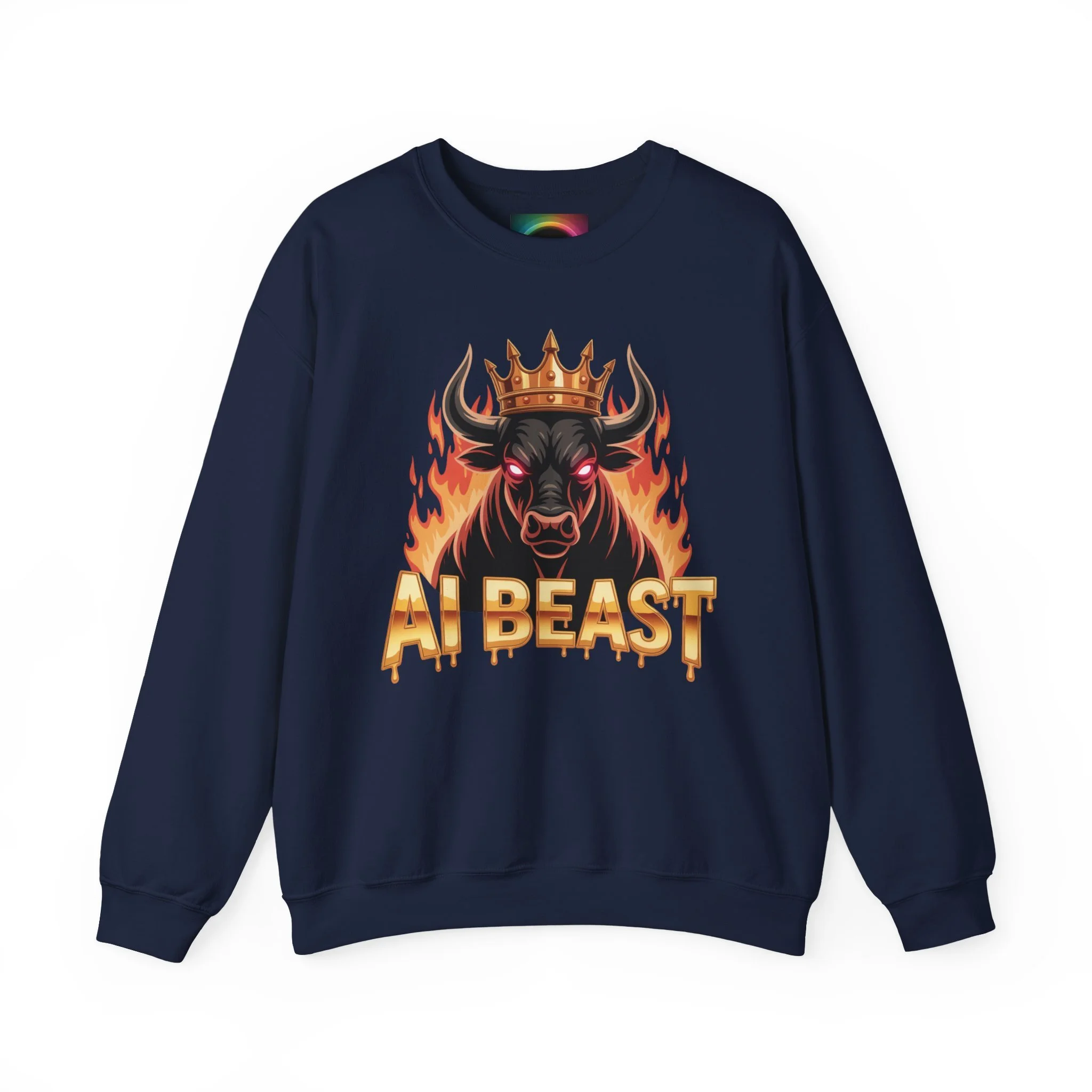 This crewneck carries a bold, streetwise energy — a crowned bull blazing through flames with 'AI BEAST' lettering that demands attention. The medium-heavy 50/50 cotton-poly fabric feels substantial and warm without weighing you down. Clean double-needle construction and a ribbed knit collar keep the silhouette crisp after repeated wear. Wear it layered over a tee for late-night coding sessions, to gaming meetups, or when you want to turn heads on a weekend walk. The graphic sits confidently on the chest and reads like a personal emblem: fierce, a little mischievous, and unapologetically loud. The tear-away neck label keeps the inside soft, while the option for embroidered placements and printed wrist marks means you can dial in extra detail for a customized look.
