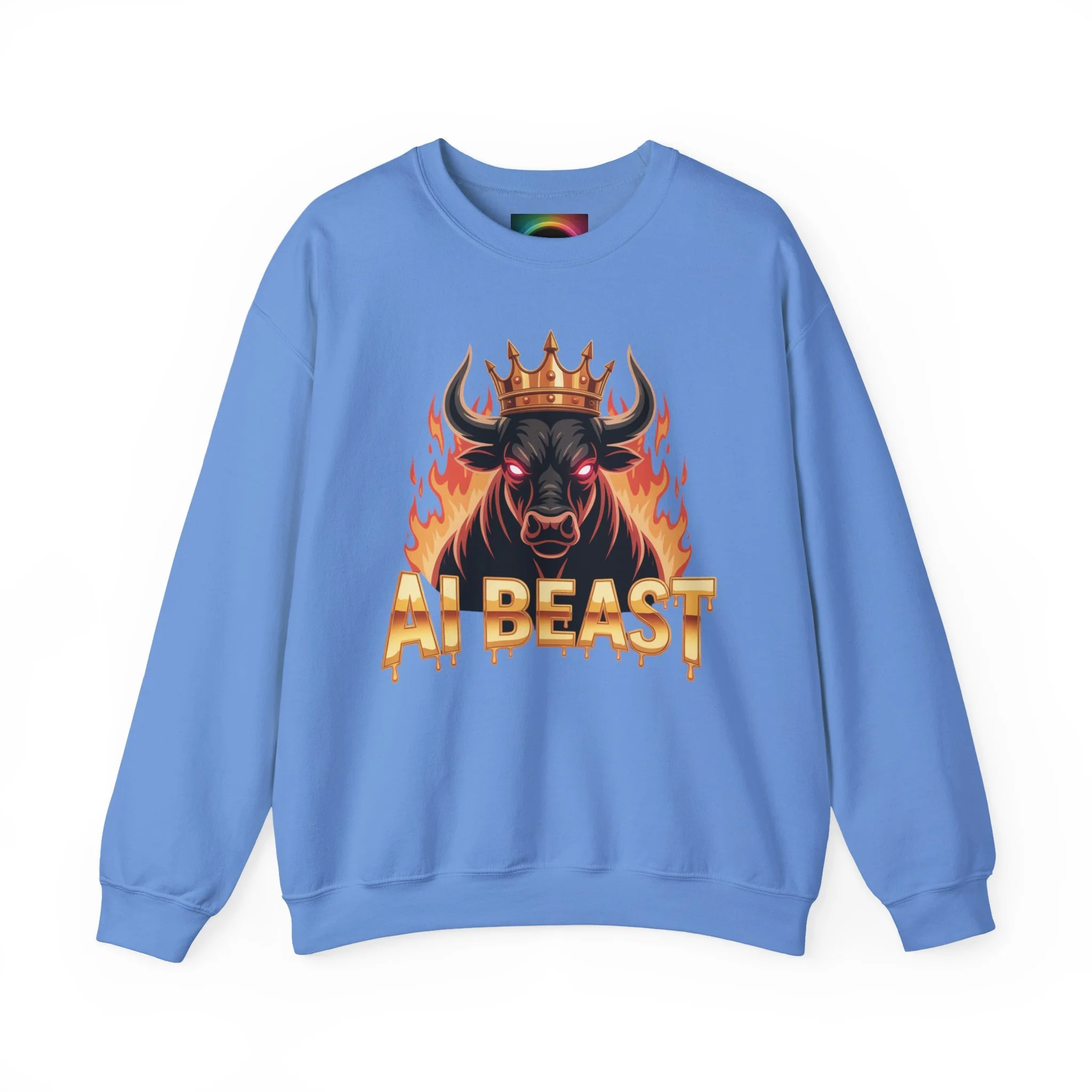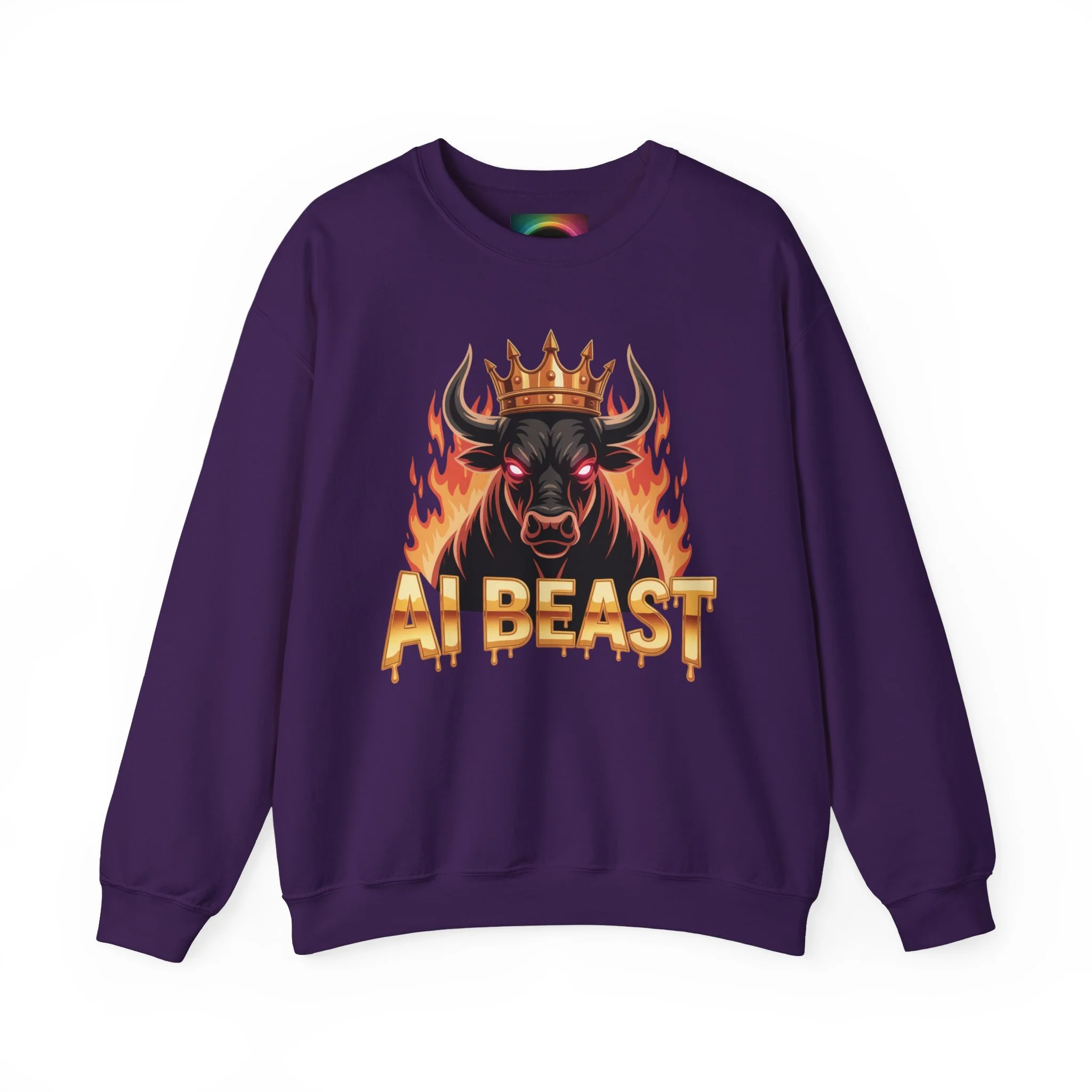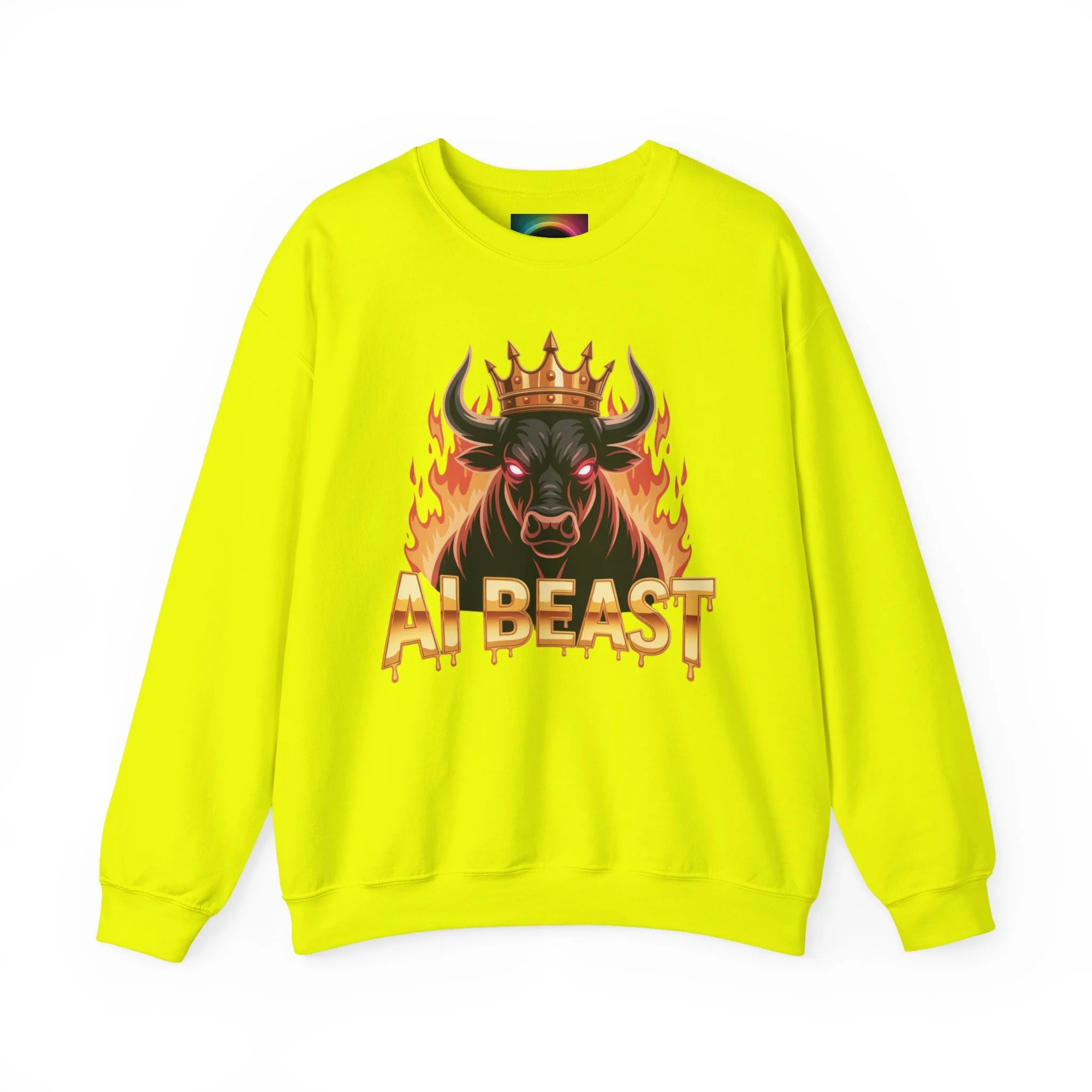 This crewneck carries a bold, streetwise energy — a crowned bull blazing through flames with 'AI BEAST' lettering that demands attention. The medium-heavy 50/50 cotton-poly fabric feels substantial and warm without weighing you down. Clean double-needle construction and a ribbed knit collar keep the silhouette crisp after repeated wear. Wear it layered over a tee for late-night coding sessions, to gaming meetups, or when you want to turn heads on a weekend walk. The graphic sits confidently on the chest and reads like a personal emblem: fierce, a little mischievous, and unapologetically loud. The tear-away neck label keeps the inside soft, while the option for embroidered placements and printed wrist marks means you can dial in extra detail for a customized look.