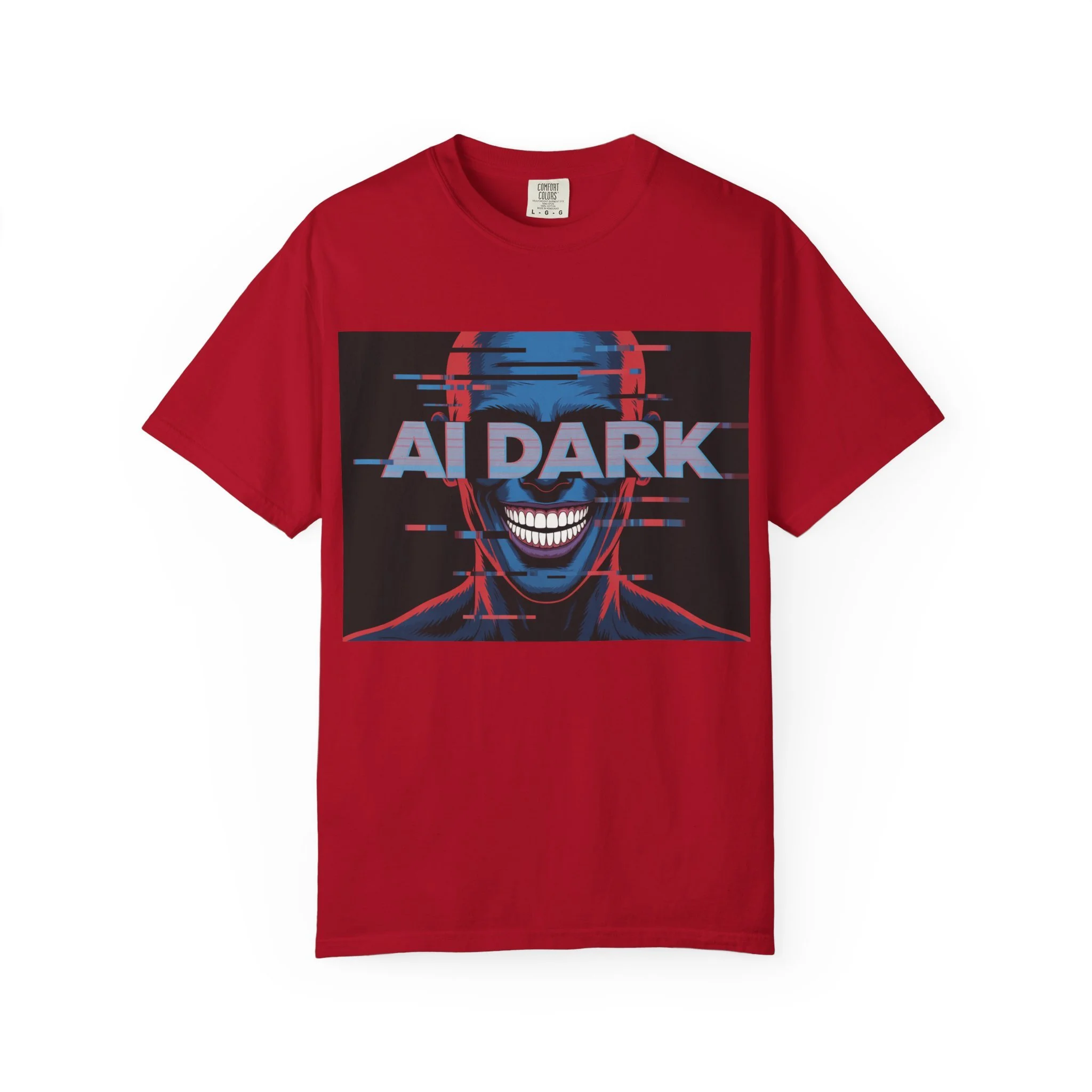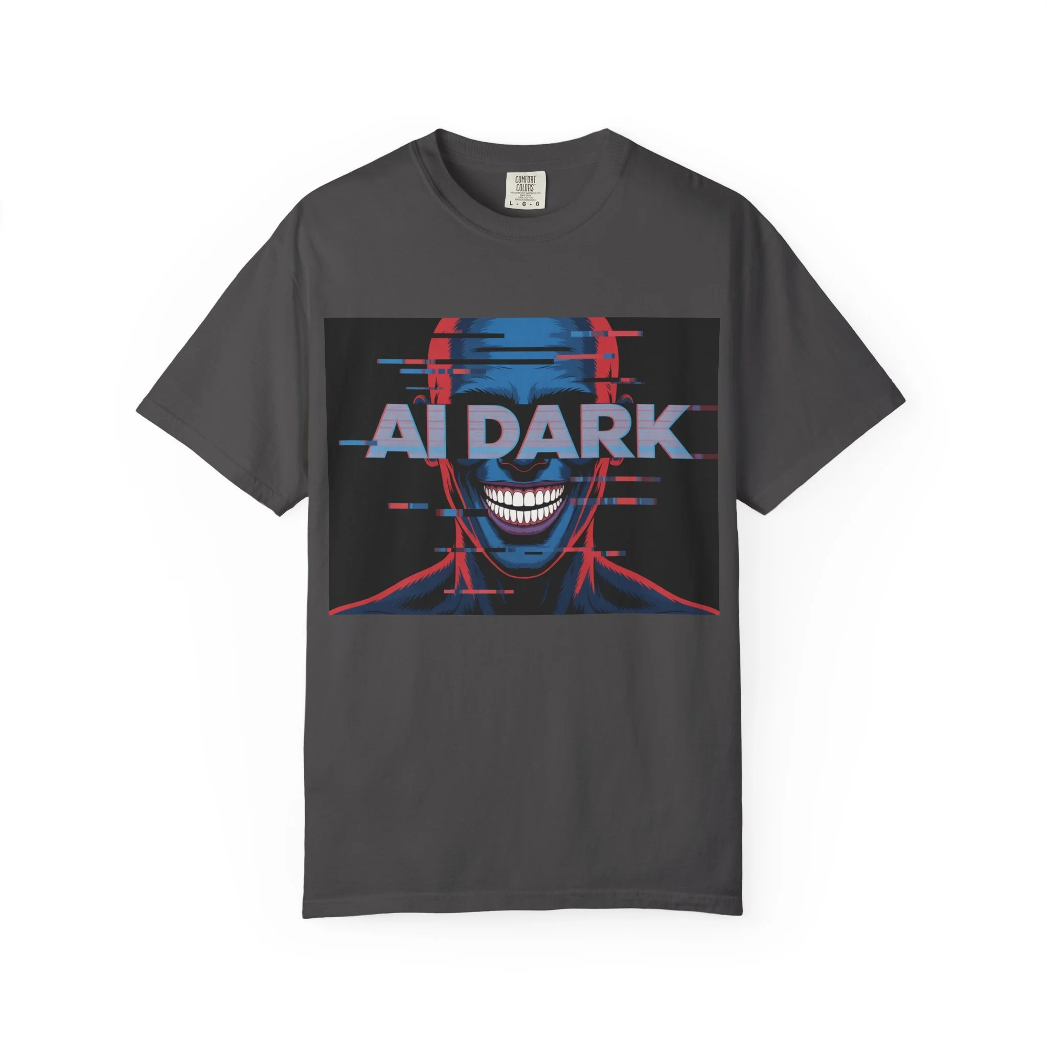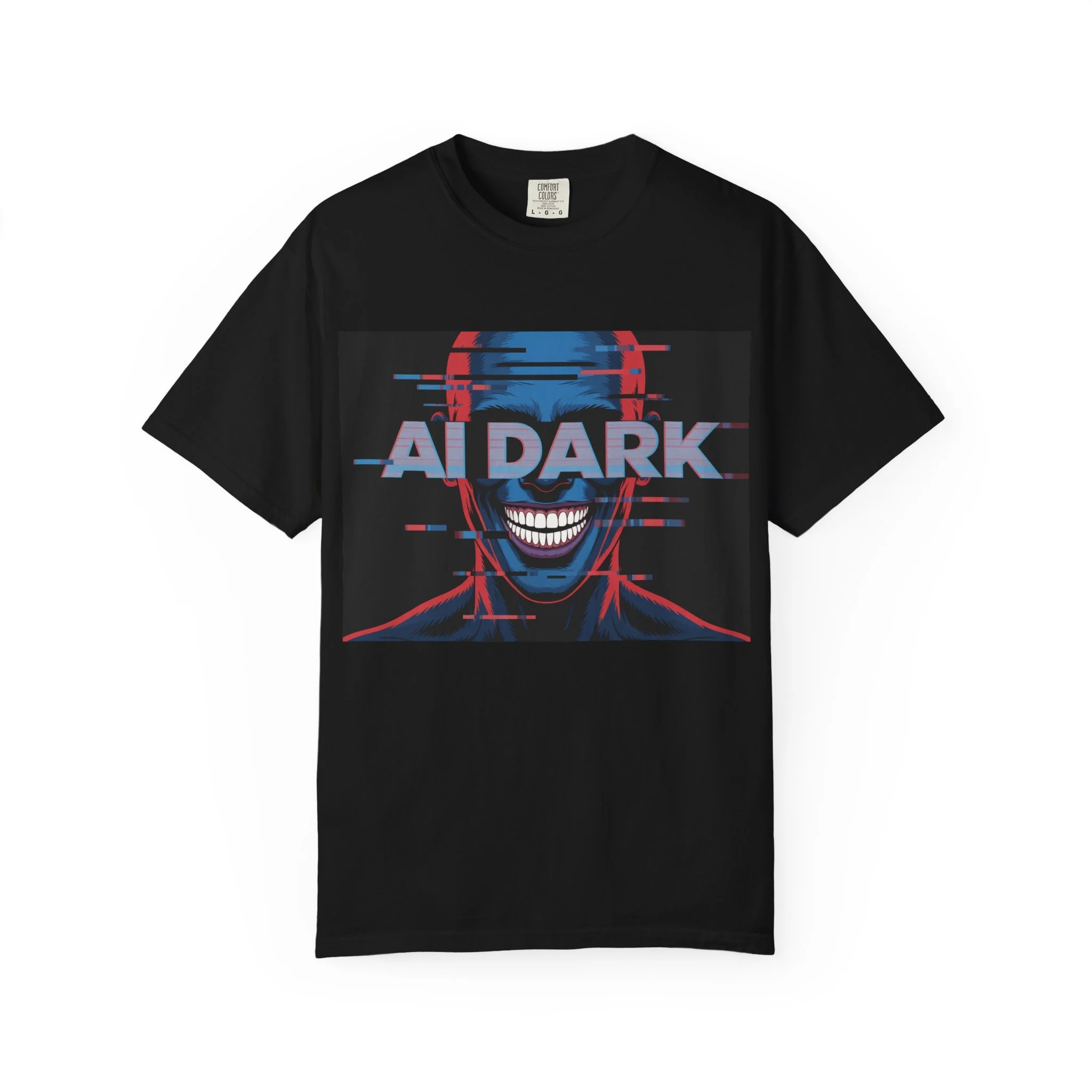 This relaxed-fit garment-dyed tee brings a dark, cyberpunk edge to everyday wear. The bold front print—a glitchy, grinning face with neon red and blue accents and the words 'AI DARK'—carries a rebellious, futuristic mood. The heavyweight, ring-spun cotton feels substantial and soft thanks to post-construction dyeing, so the color and texture develop a lived-in character over time. Wear it with ripped jeans, layered under a leather jacket, or alone to let the graphic speak: it’s for nights out at underground shows, late-night coding sessions, or anyone who prefers their style with a little bite and a lot of attitude.