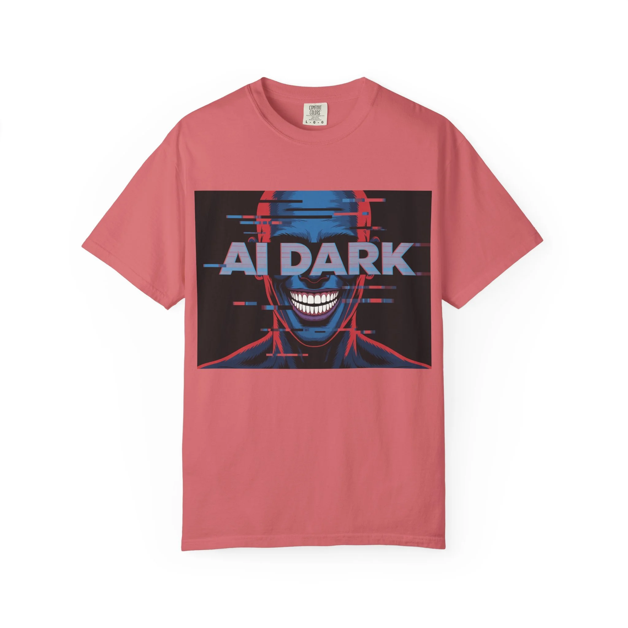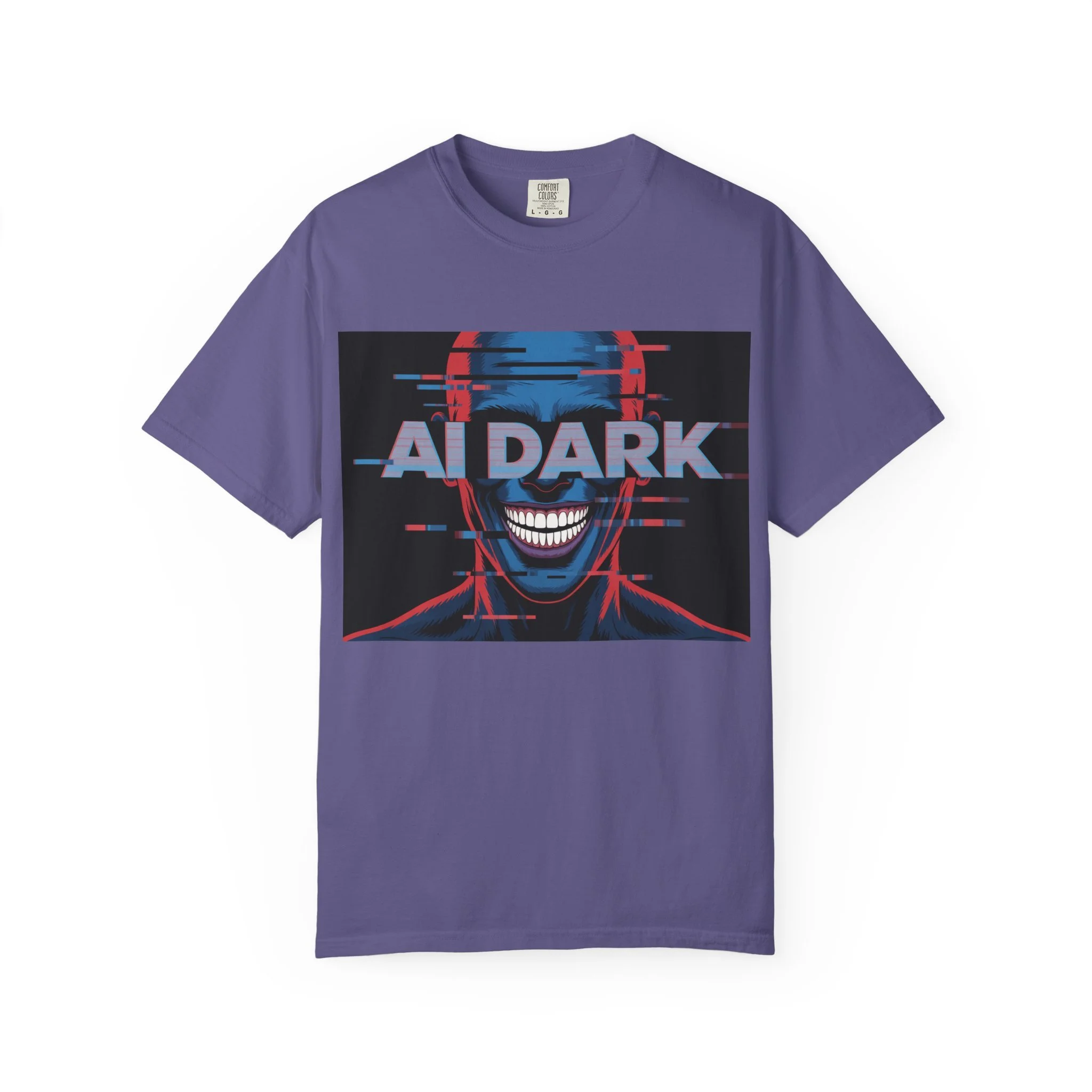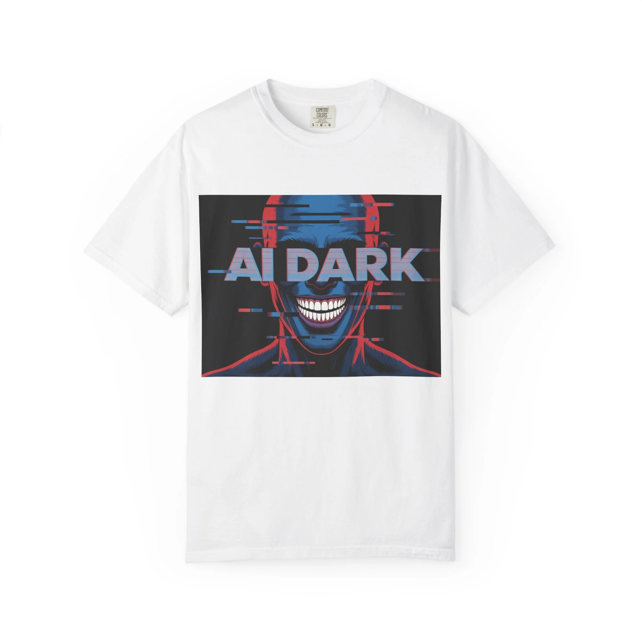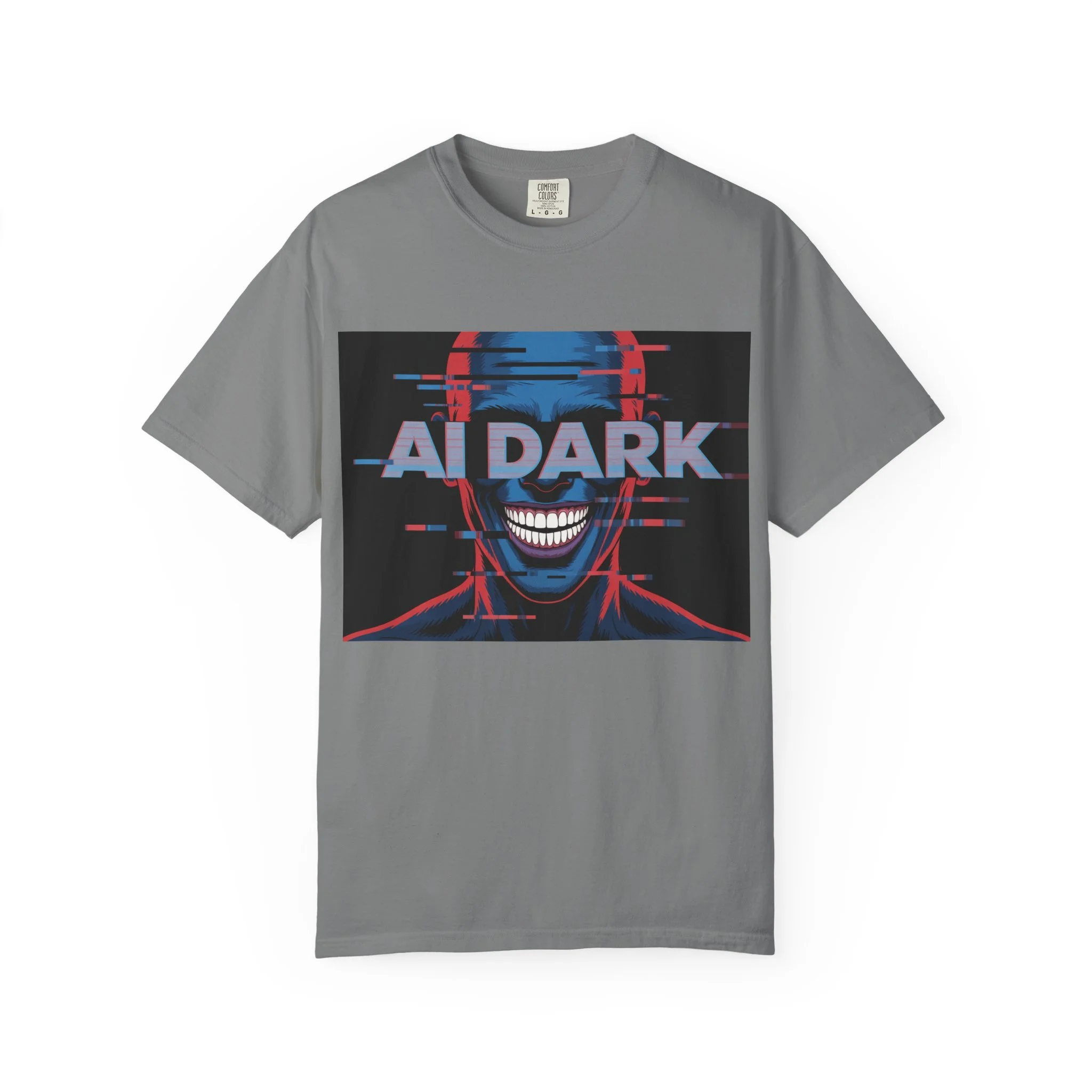 This relaxed-fit garment-dyed tee brings a dark, cyberpunk edge to everyday wear. The bold front print—a glitchy, grinning face with neon red and blue accents and the words 'AI DARK'—carries a rebellious, futuristic mood. The heavyweight, ring-spun cotton feels substantial and soft thanks to post-construction dyeing, so the color and texture develop a lived-in character over time. Wear it with ripped jeans, layered under a leather jacket, or alone to let the graphic speak: it’s for nights out at underground shows, late-night coding sessions, or anyone who prefers their style with a little bite and a lot of attitude.