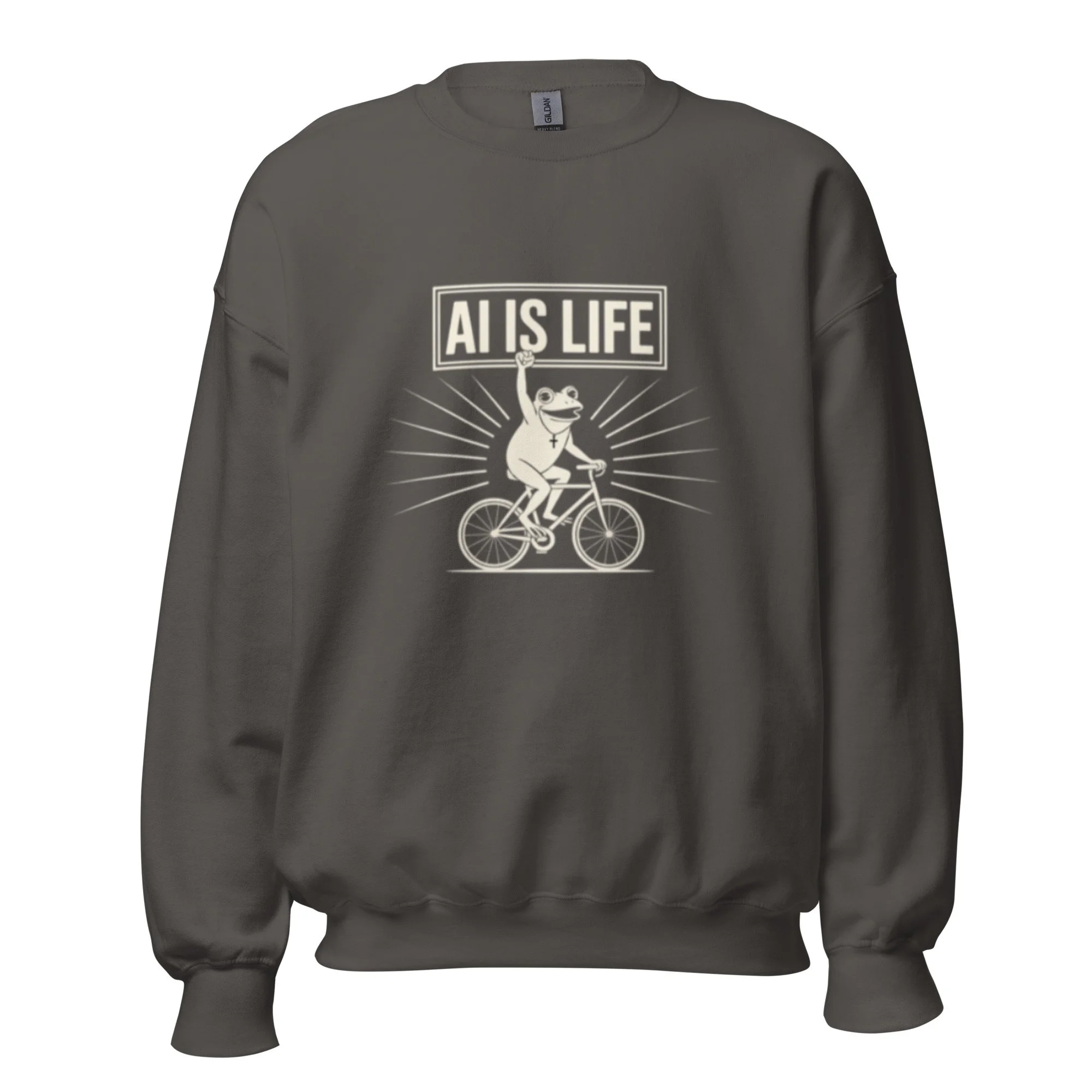 A minimalist retro-inspired design featuring a cycling frog and bold typography for modern AI clothing enthusiasts. A sturdy and warm sweatshirt bound to keep you warm in the colder months. A pre-shrunk, classic fit sweater that’s made with air-jet spun yarn for a soft feel.