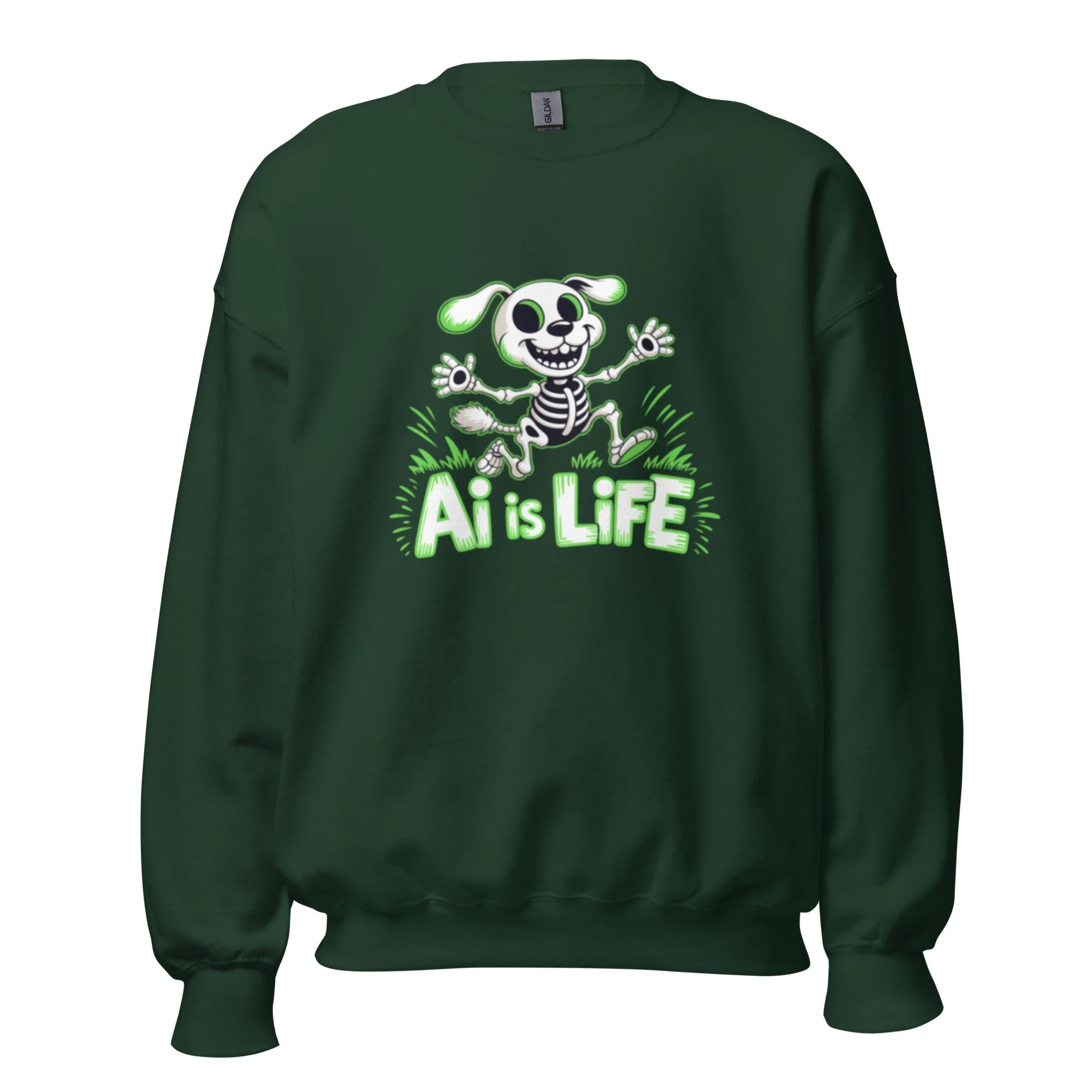 A glowing neon skeletal pup brings a high-voltage, playful energy to the digital dark. This design is a striking balance of macabre and fun for your AI clothing collection. A sturdy and warm sweatshirt bound to keep you warm in the colder months. A pre-shrunk, classic fit sweater that’s made with air-jet spun yarn for a soft feel.