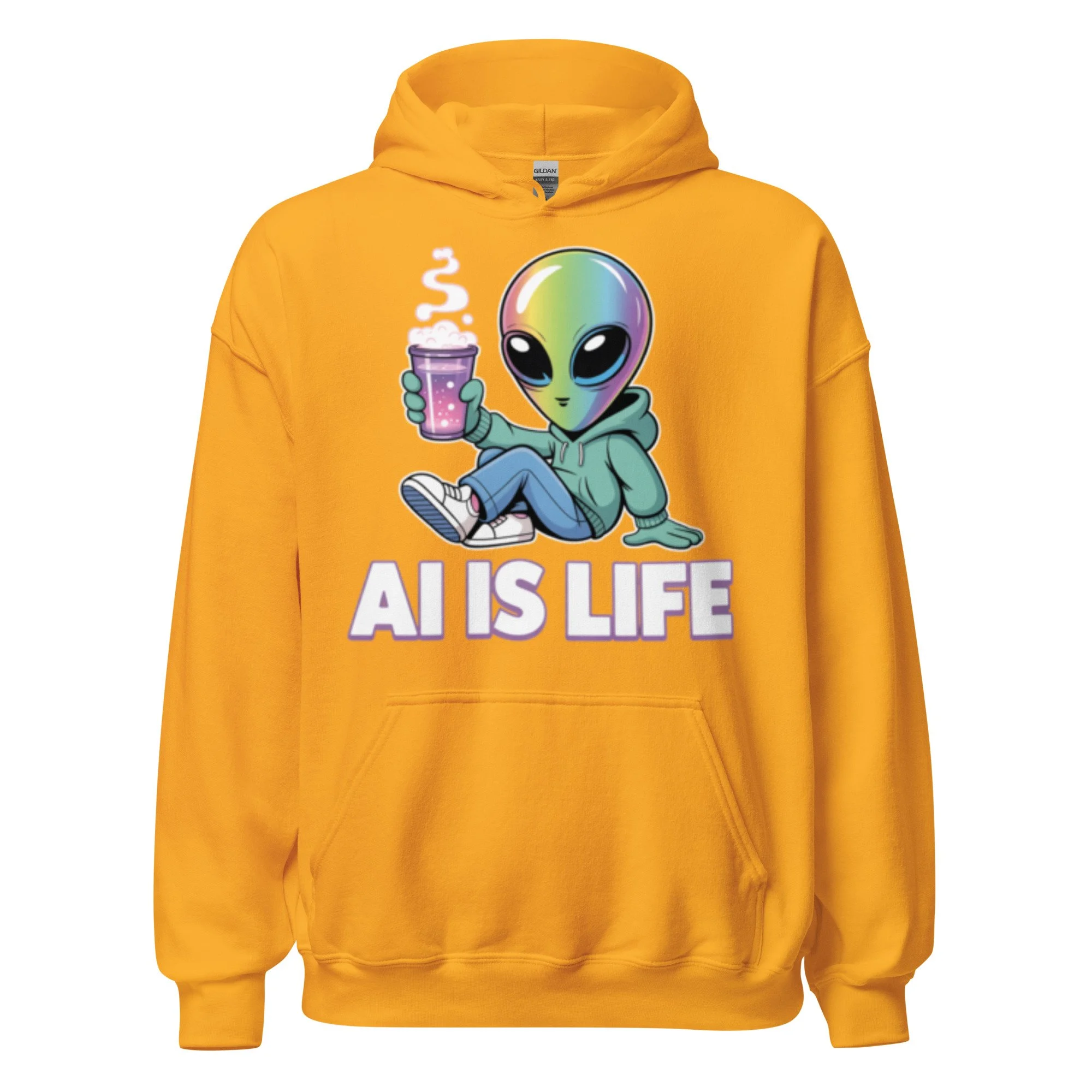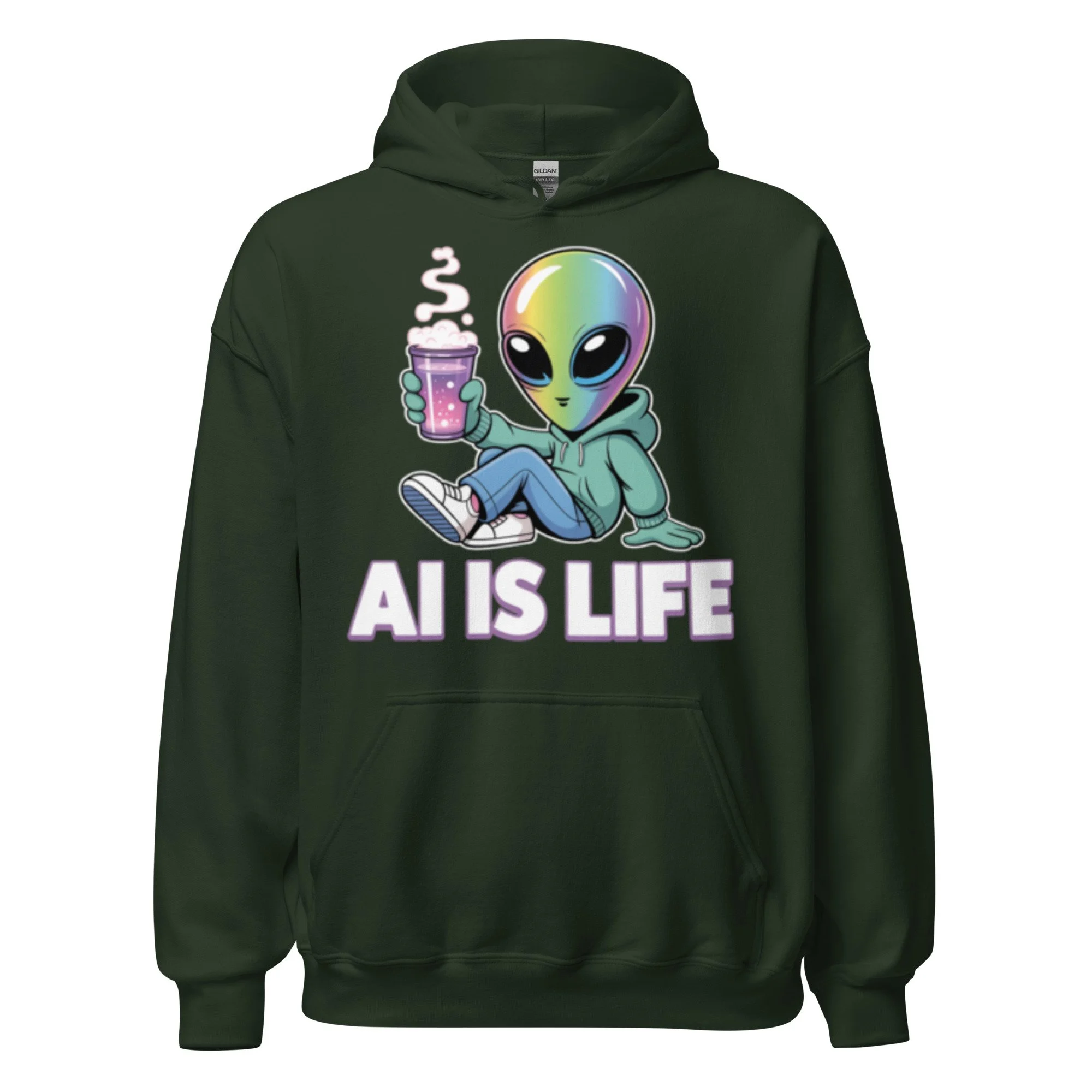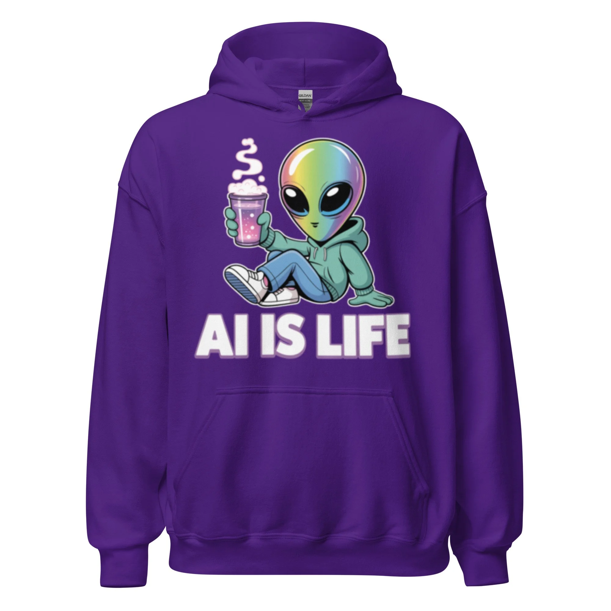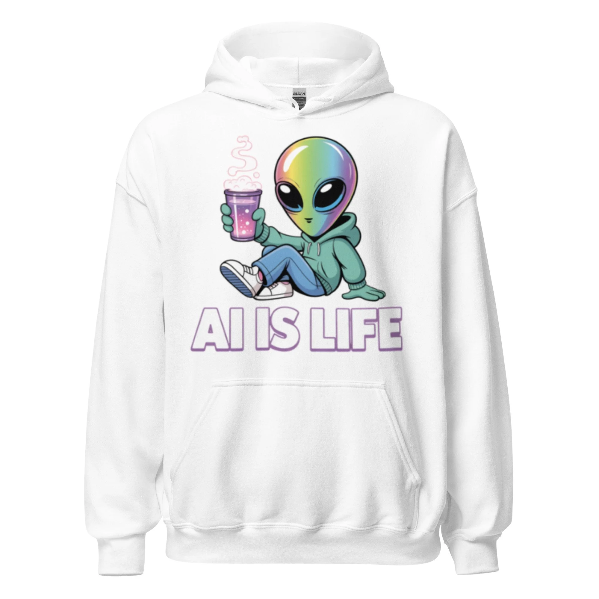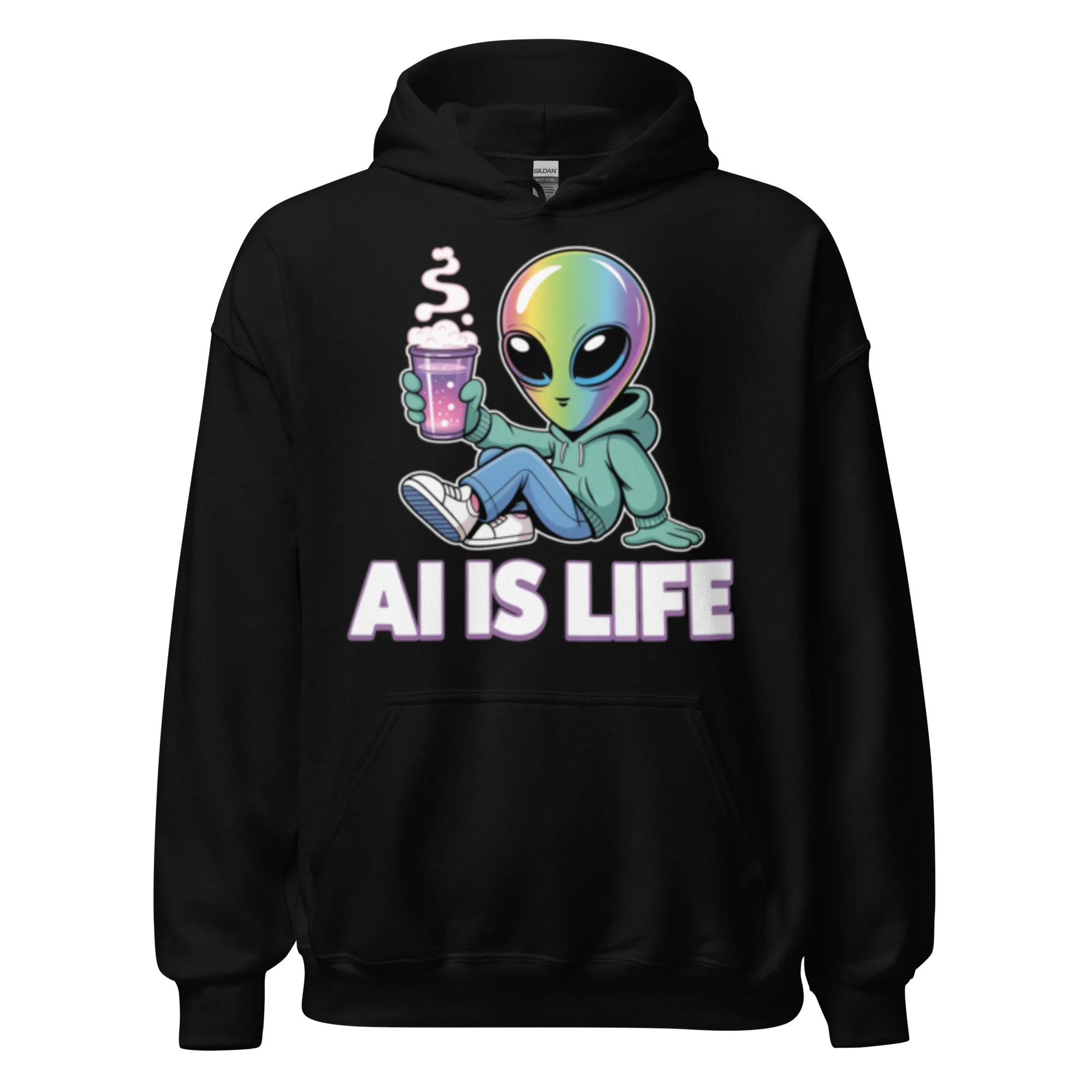 A chill iridescent alien sipping a cosmic brew brings a laid-back, extraterrestrial vibe to your wardrobe. This design is a psychedelic centerpiece for any modern AI clothing collection. Everyone needs a cozy go-to hoodie to curl up in, so go for one that's soft, smooth, and stylish. It's the perfect choice for cooler evenings!