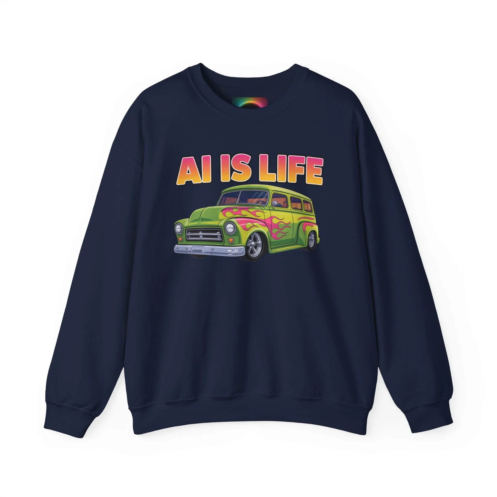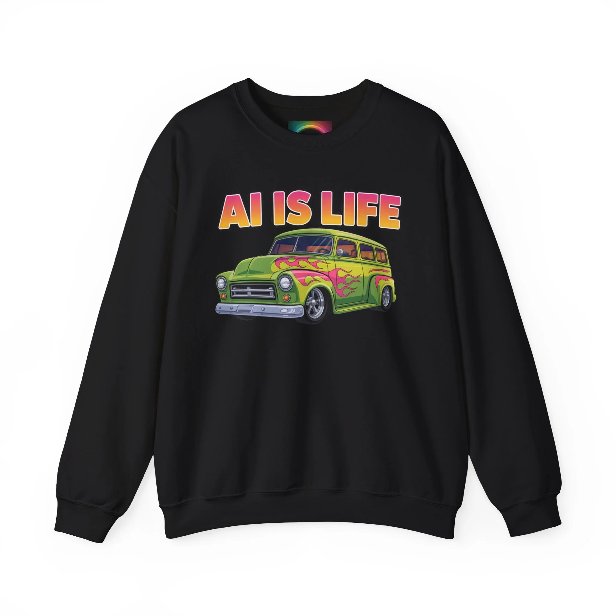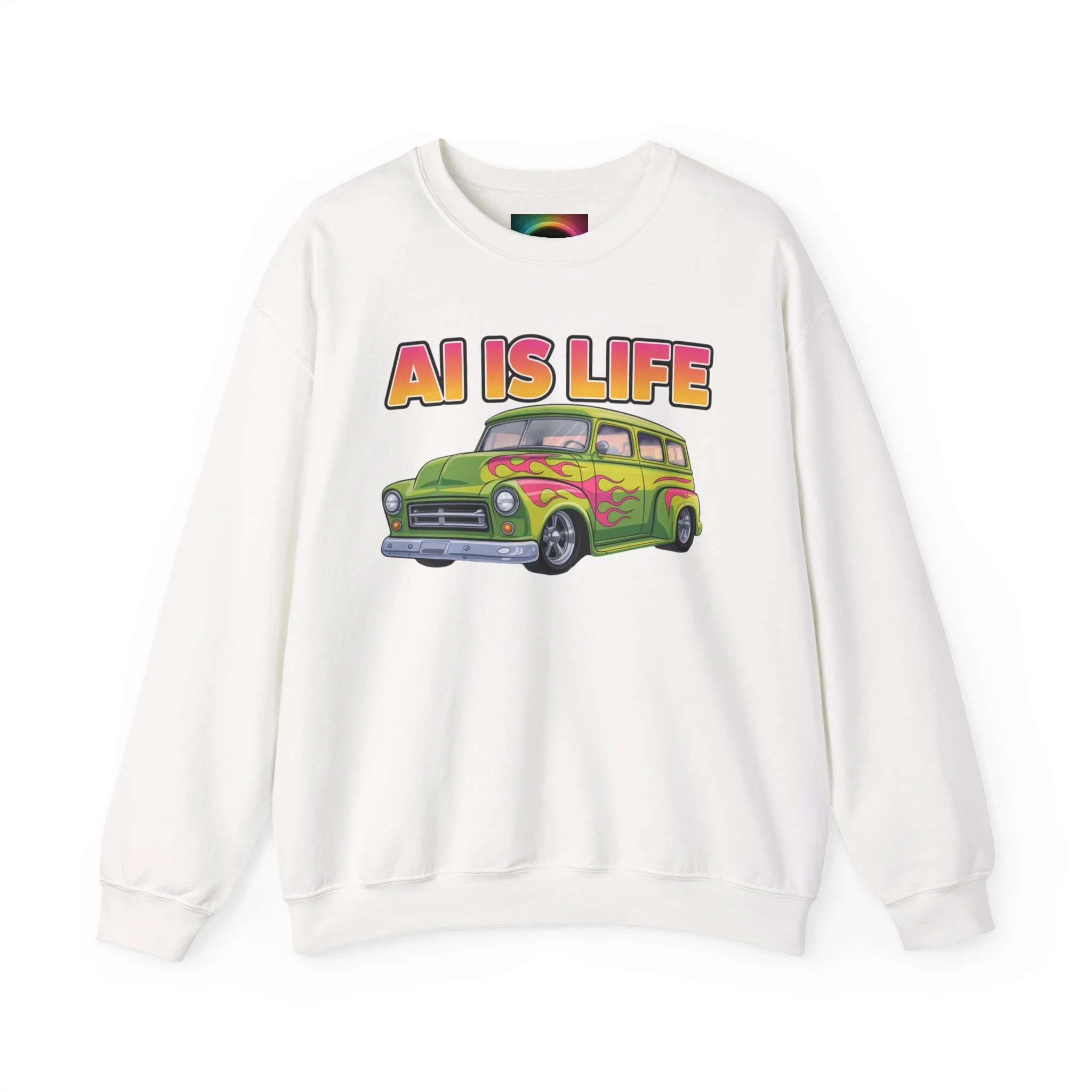 Light, nostalgic, and a little tongue-in-cheek — this crewneck brings retro road-trip vibes to your everyday wardrobe. A soft, medium-heavy cotton–poly blend keeps you warm without weighing you down, while the colorful vintage car graphic and bold "AI IS LIFE" lettering make a playful statement. The tubular knit body and ribbed collar hold their shape wash after wash. Wear it with worn jeans for a laid-back studio day or toss it on for an evening meet-up with fellow creators and tinkerers.
