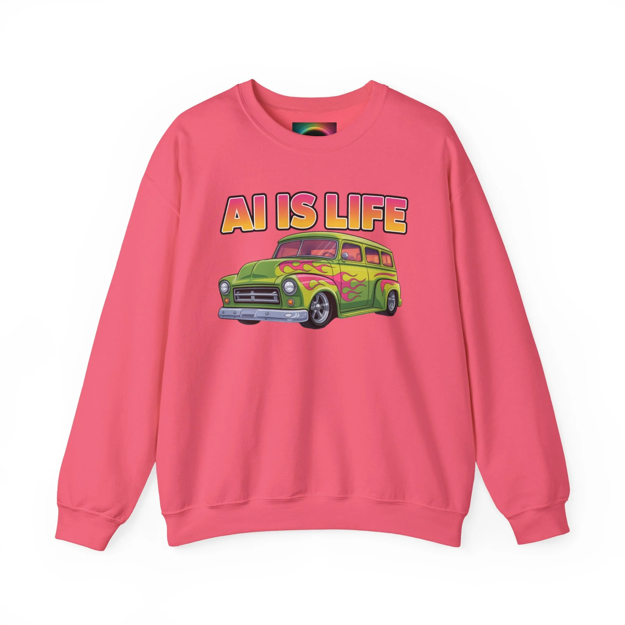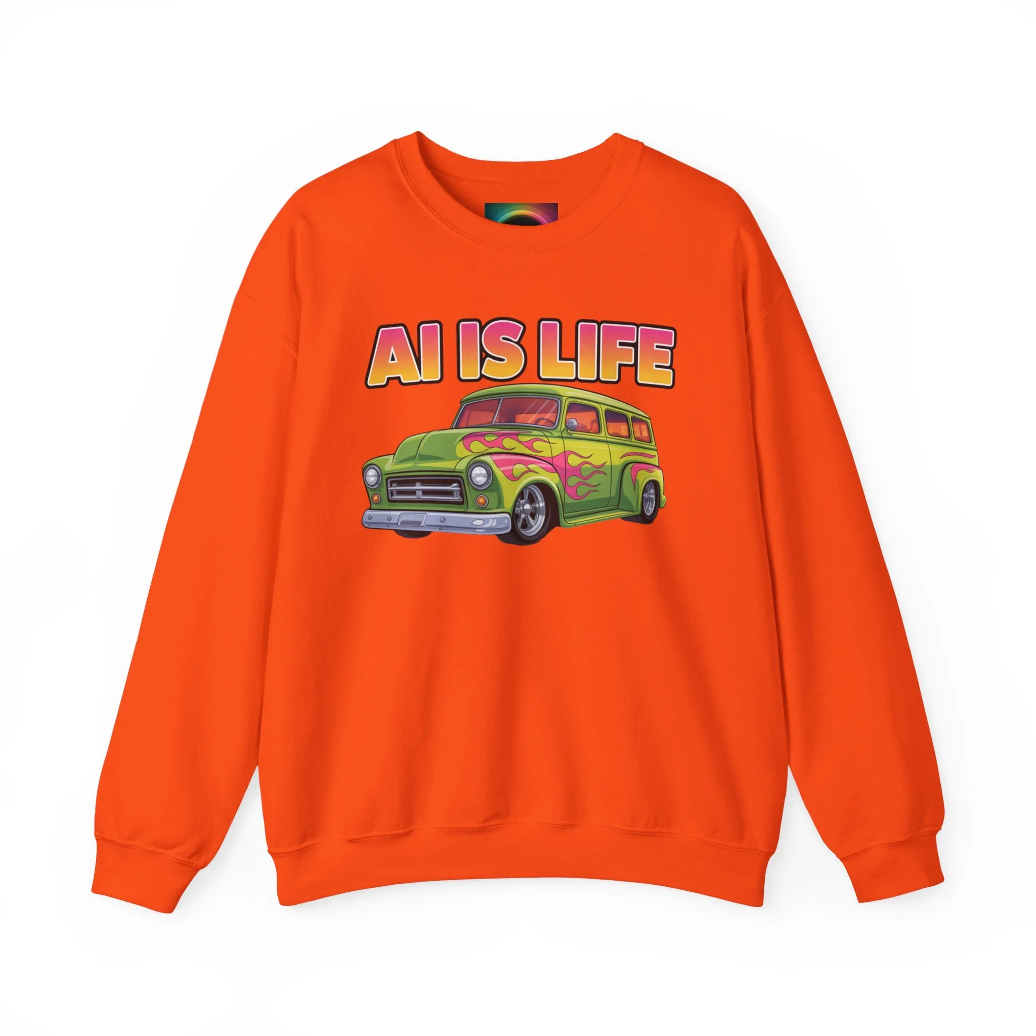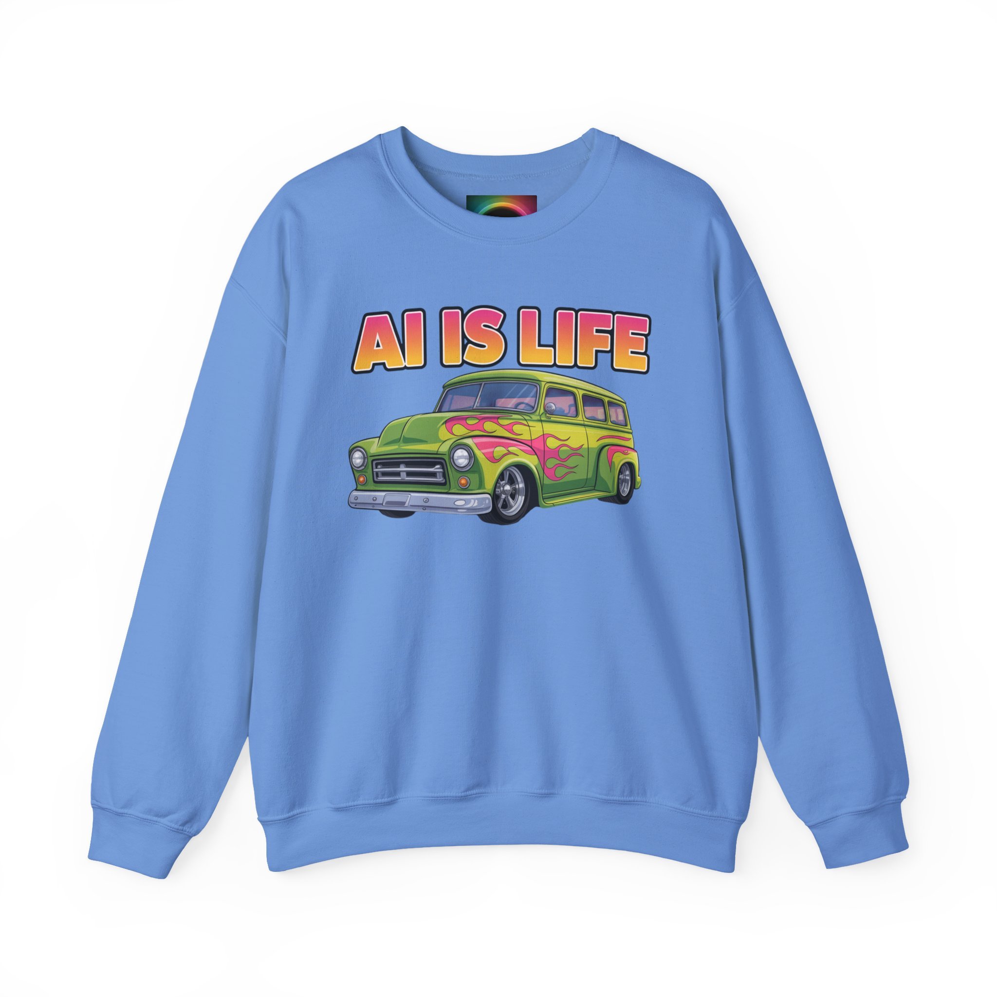 Light, nostalgic, and a little tongue-in-cheek — this crewneck brings retro road-trip vibes to your everyday wardrobe. A soft, medium-heavy cotton–poly blend keeps you warm without weighing you down, while the colorful vintage car graphic and bold "AI IS LIFE" lettering make a playful statement. The tubular knit body and ribbed collar hold their shape wash after wash. Wear it with worn jeans for a laid-back studio day or toss it on for an evening meet-up with fellow creators and tinkerers.