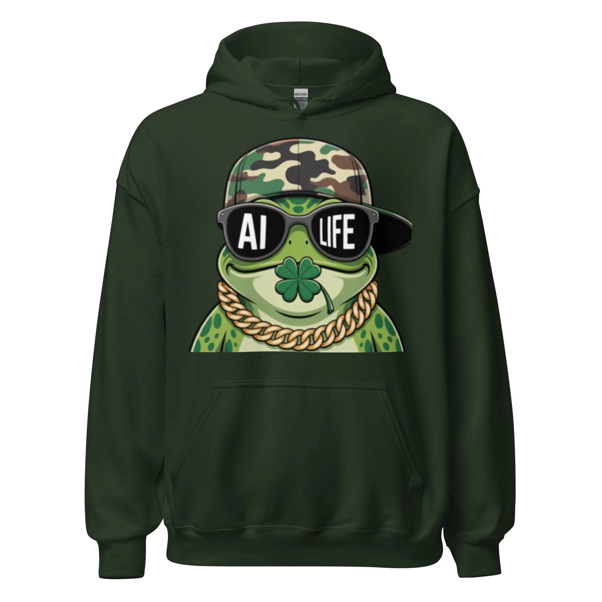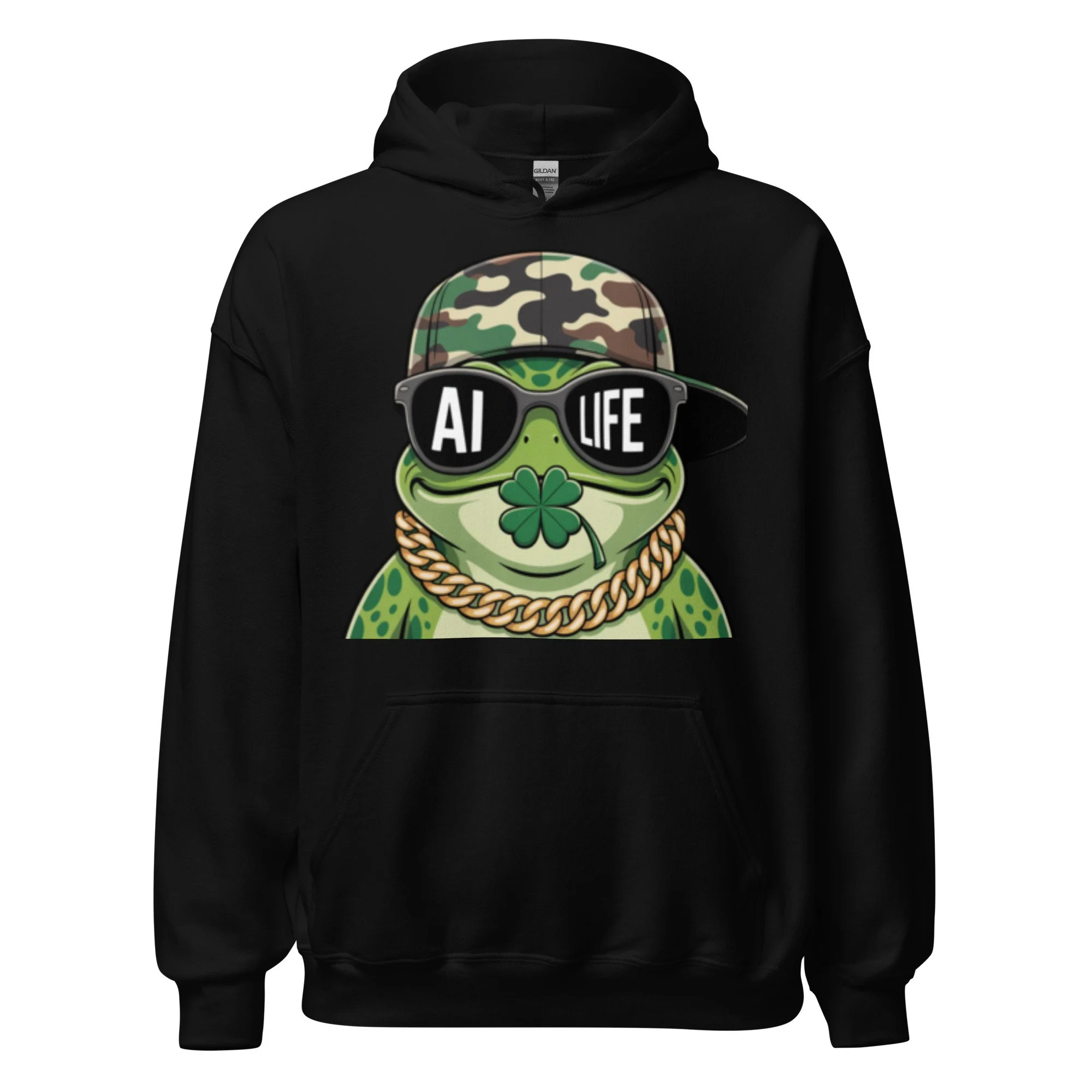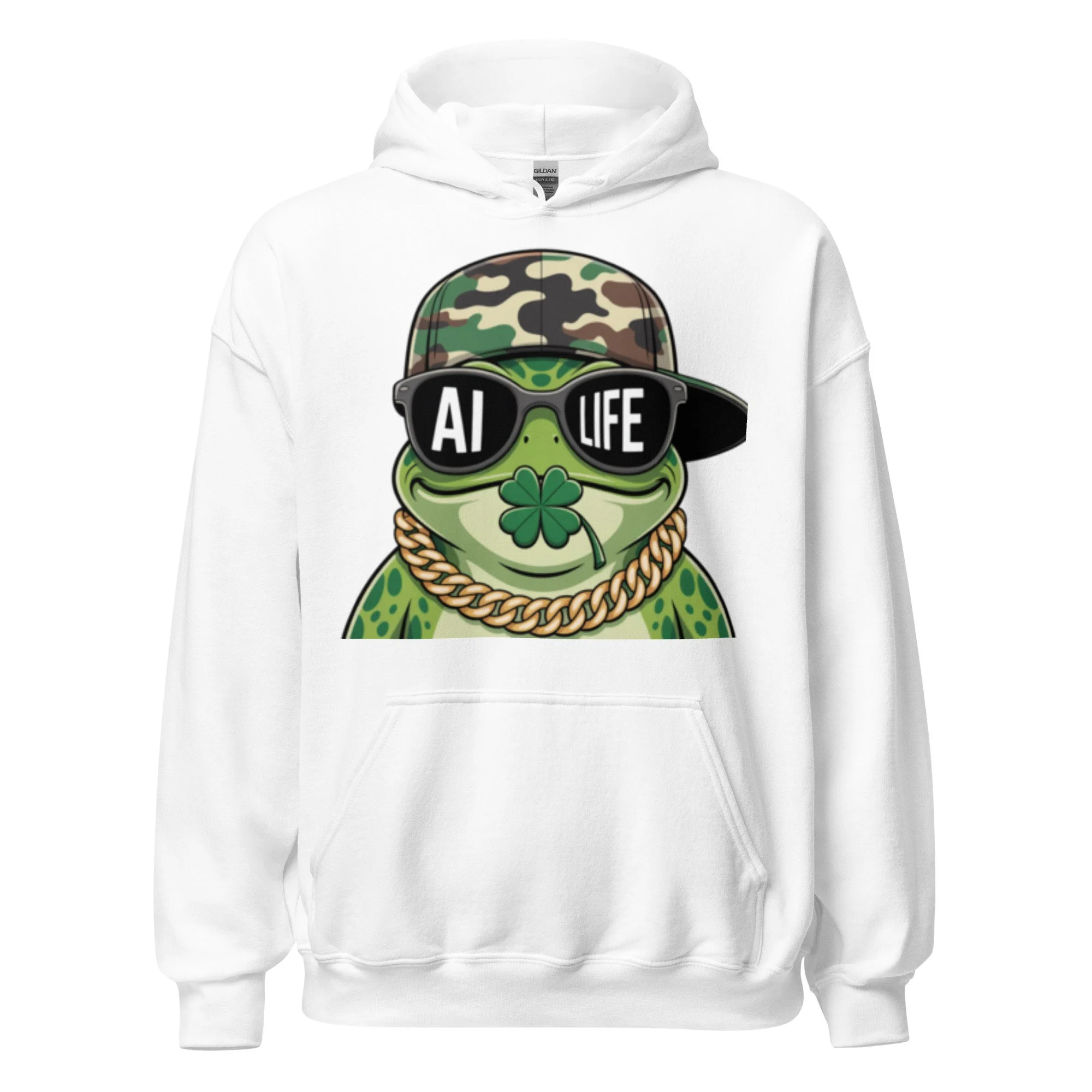 A streetwear-ready amphibian rocking a gold chain and camo cap defines this high-energy urban aesthetic. Level up your wardrobe with this bold and charismatic piece of AI clothing. Everyone needs a cozy go-to hoodie to curl up in, so go for one that's soft, smooth, and stylish. It's the perfect choice for cooler evenings!