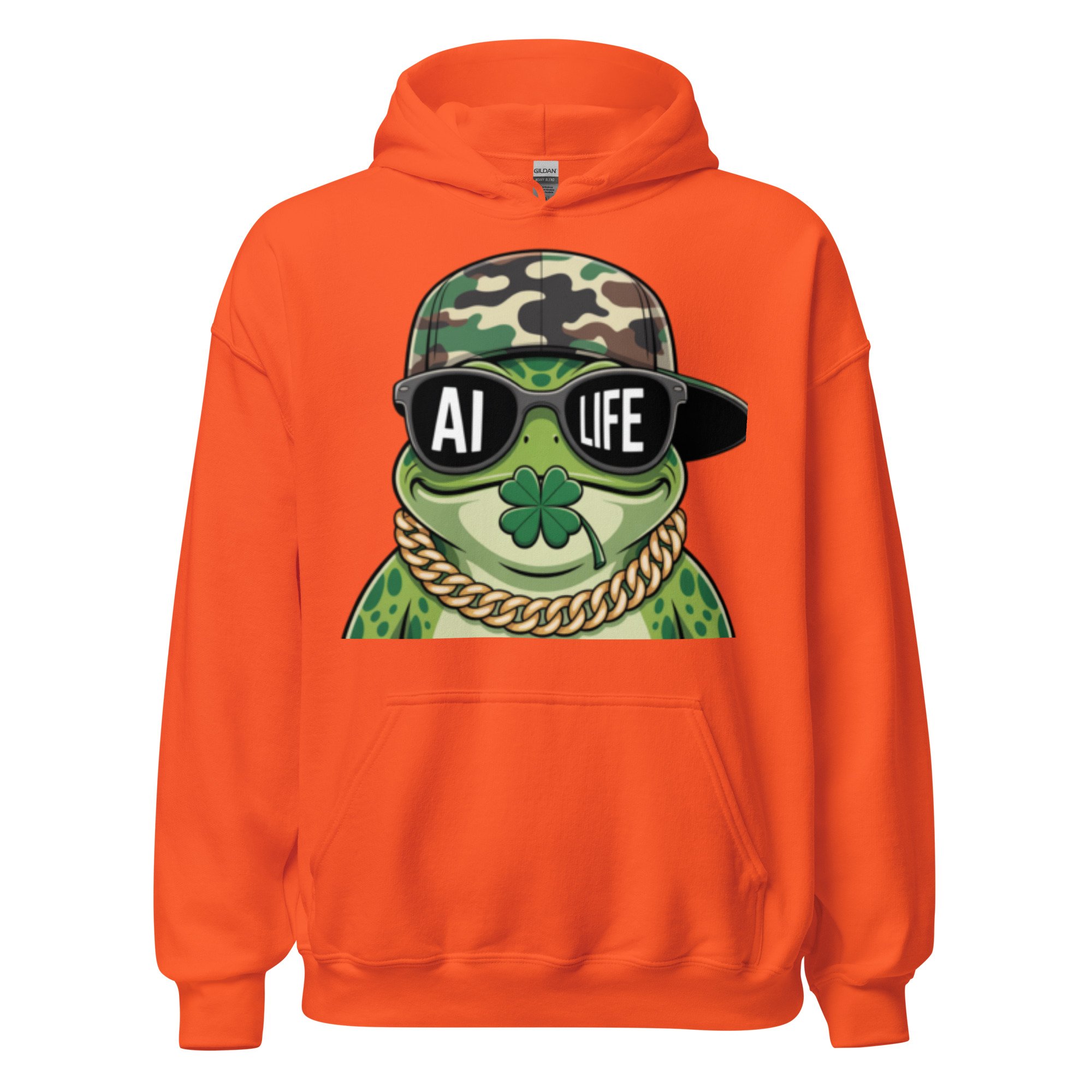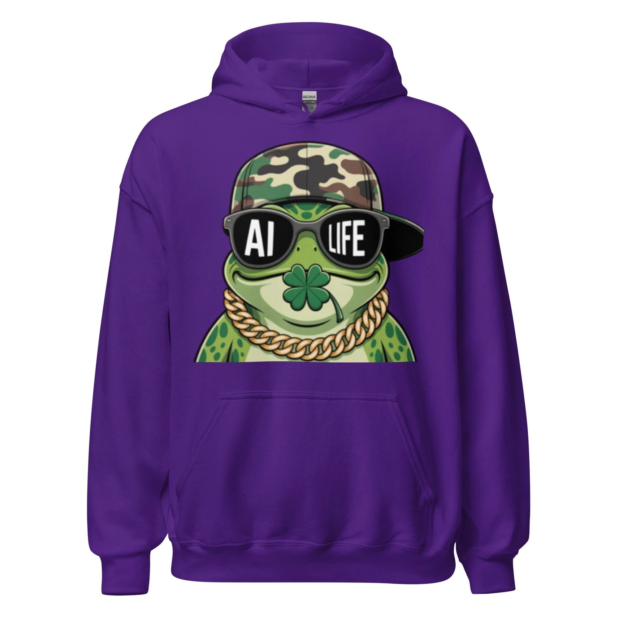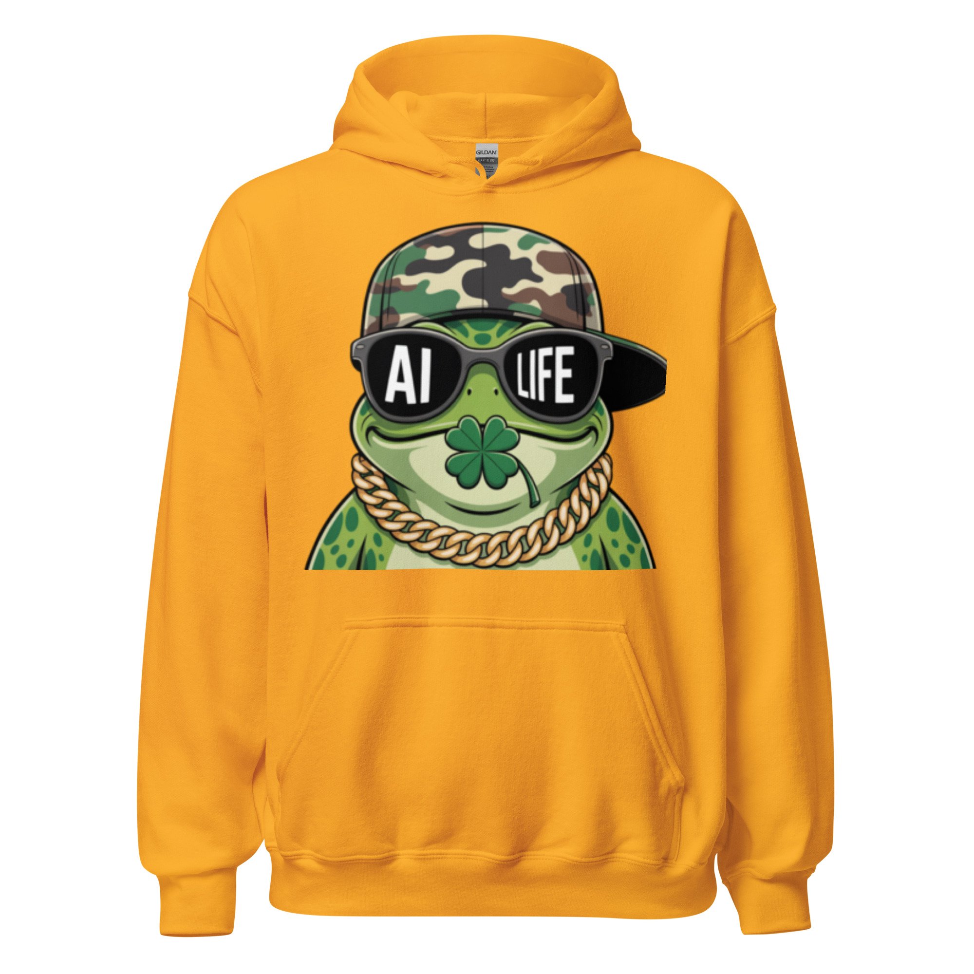 A streetwear-ready amphibian rocking a gold chain and camo cap defines this high-energy urban aesthetic. Level up your wardrobe with this bold and charismatic piece of AI clothing. Everyone needs a cozy go-to hoodie to curl up in, so go for one that's soft, smooth, and stylish. It's the perfect choice for cooler evenings!
