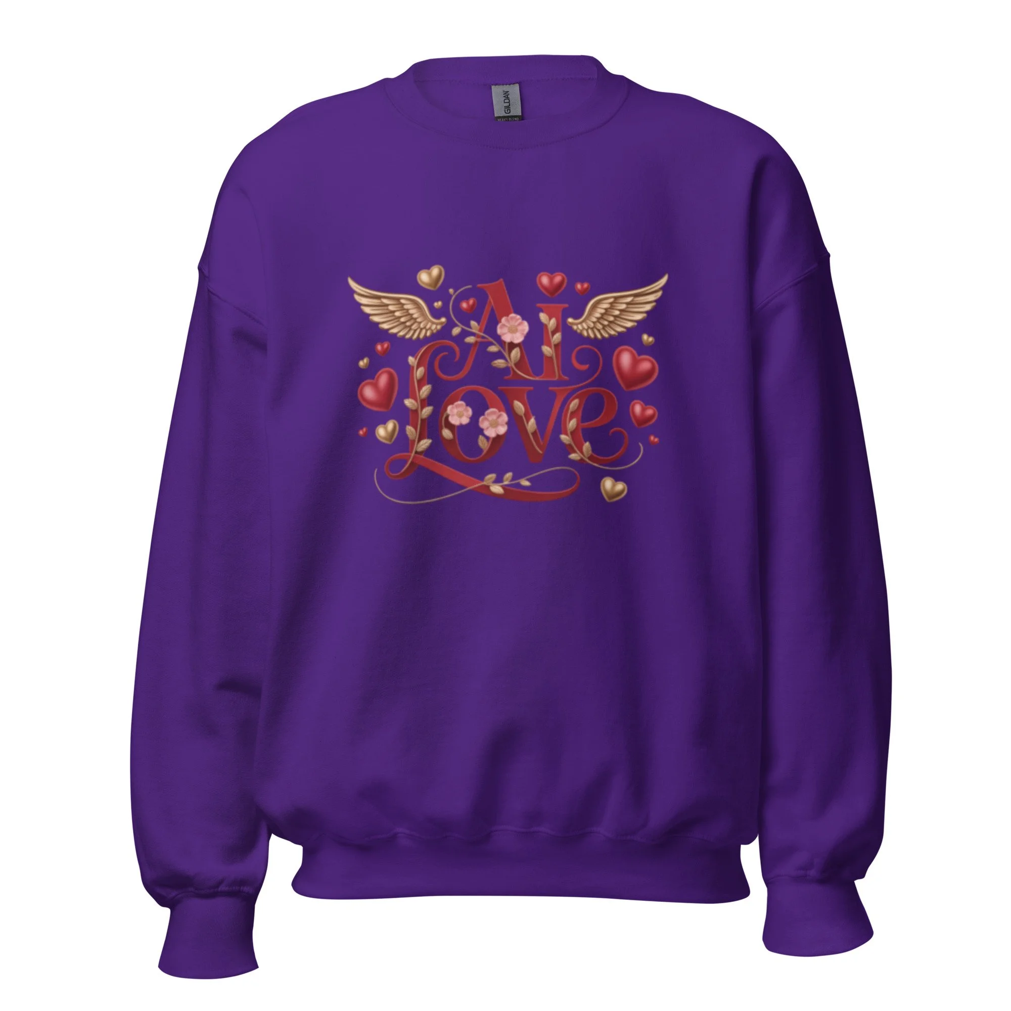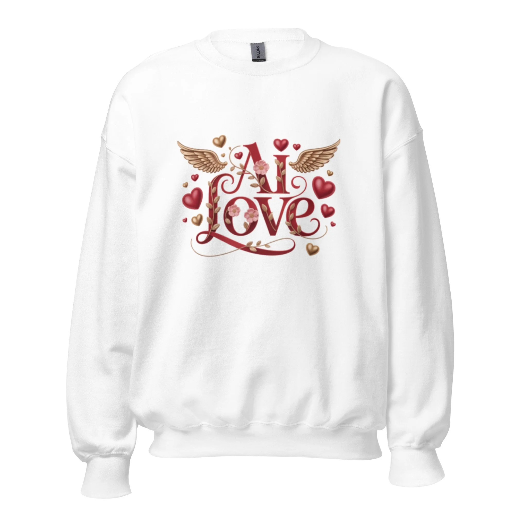 Romance meets the digital age in this intricate, heart-filled design. Featuring elegant red script and celestial wings, this "AI LOVE" graphic is a sophisticated tribute to the emotional connections we forge in a tech-driven world. A sturdy and warm sweatshirt bound to keep you warm in the colder months. A pre-shrunk, classic fit sweater that’s made with air-jet spun yarn for a soft feel.