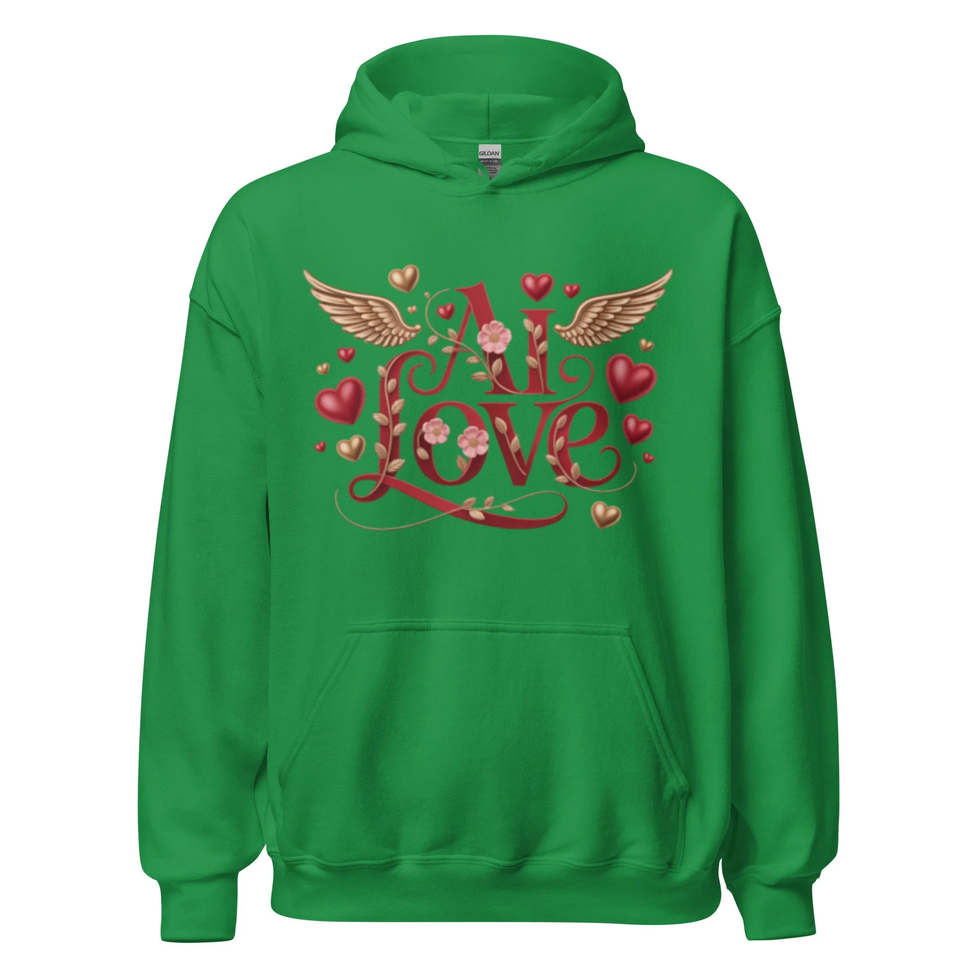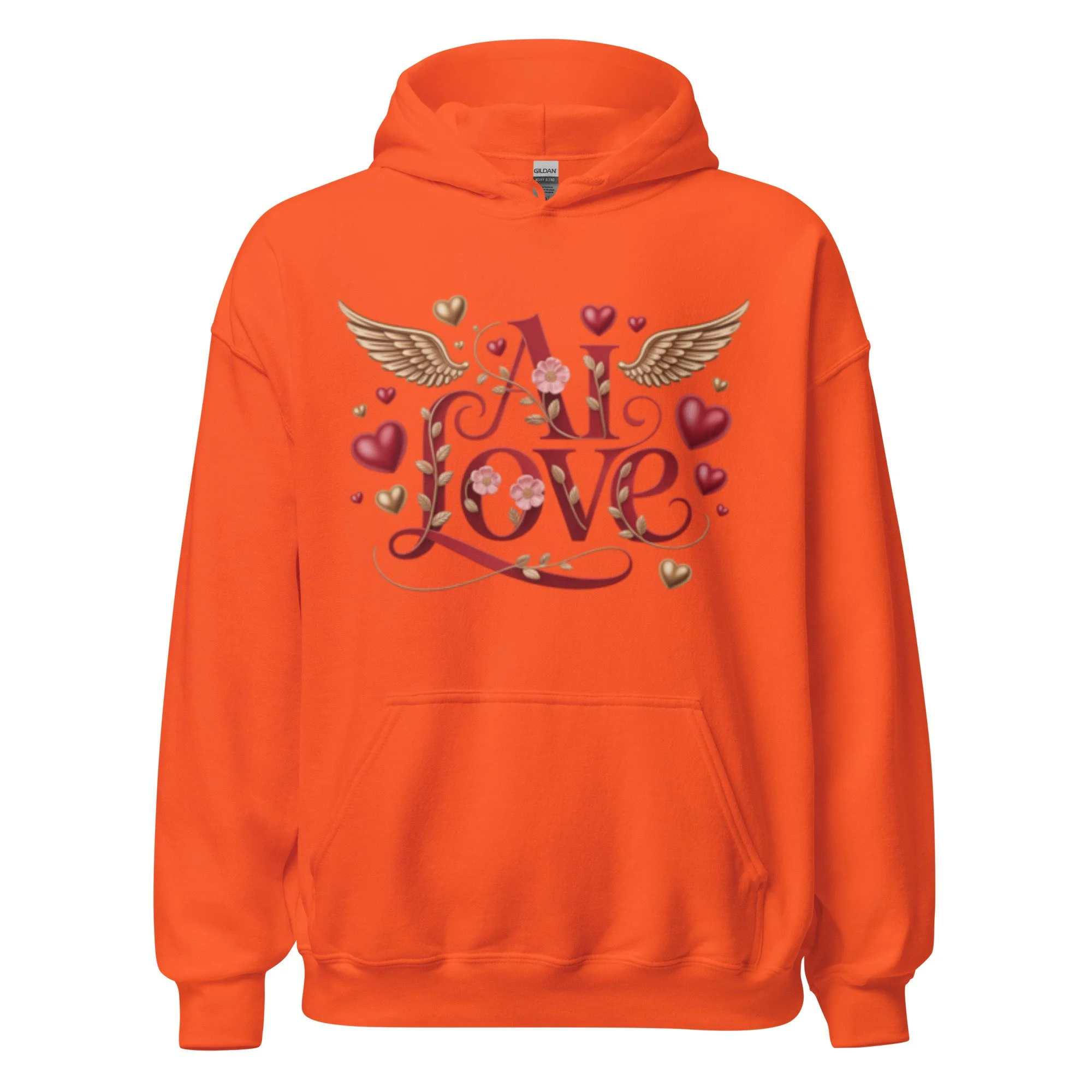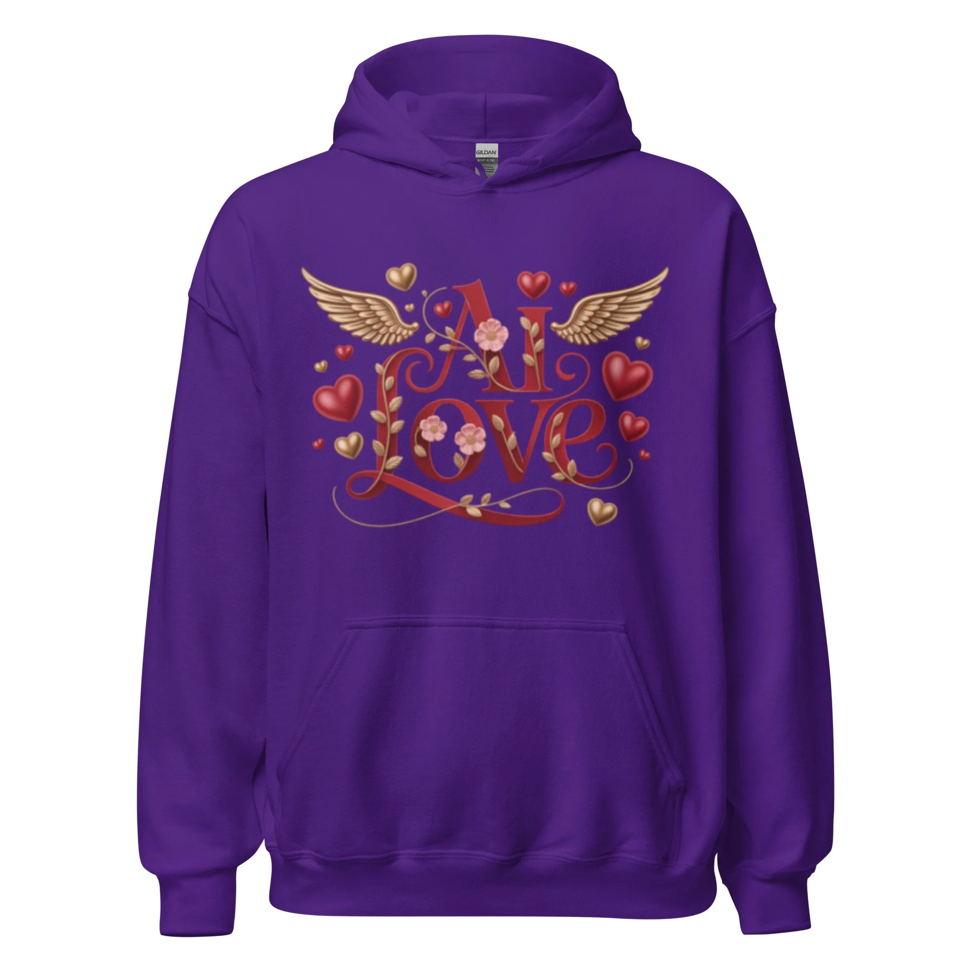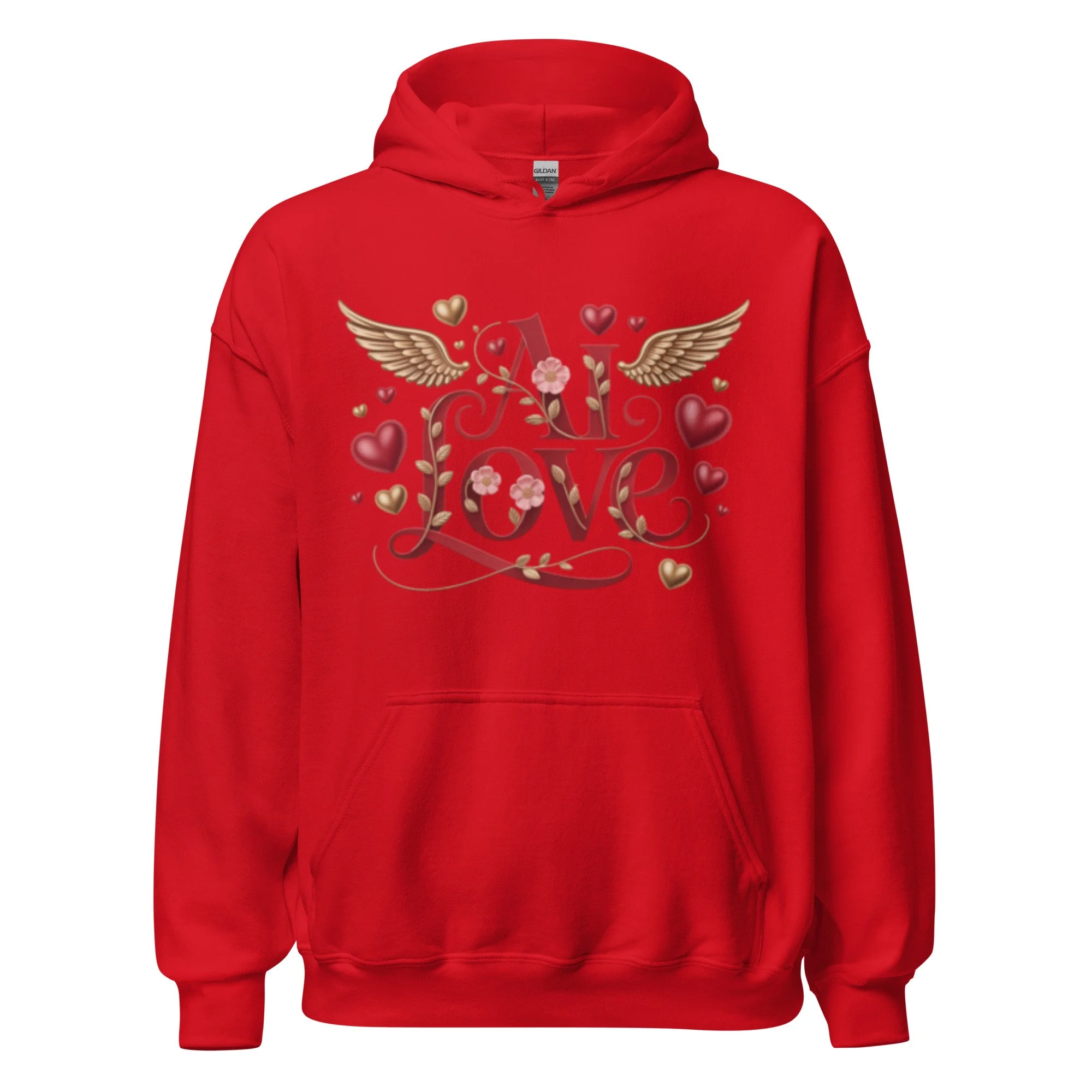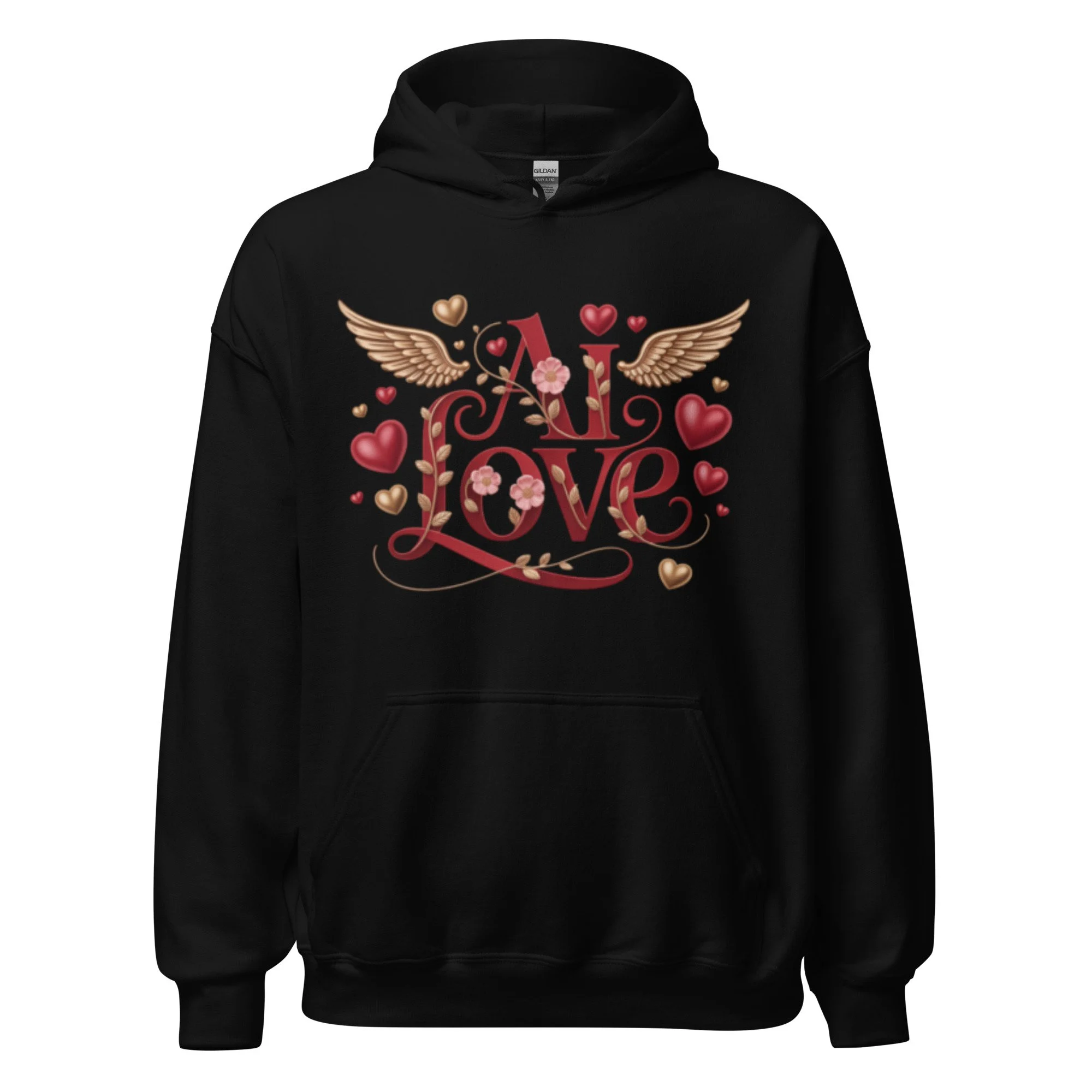 Romance meets the digital age in this intricate, heart-filled design. Featuring elegant red script and celestial wings, this "AI LOVE" graphic is a sophisticated tribute to the emotional connections we forge in a tech-driven world. Everyone needs a cozy go-to hoodie to curl up in, so go for one that's soft, smooth, and stylish. It's the perfect choice for cooler evenings!