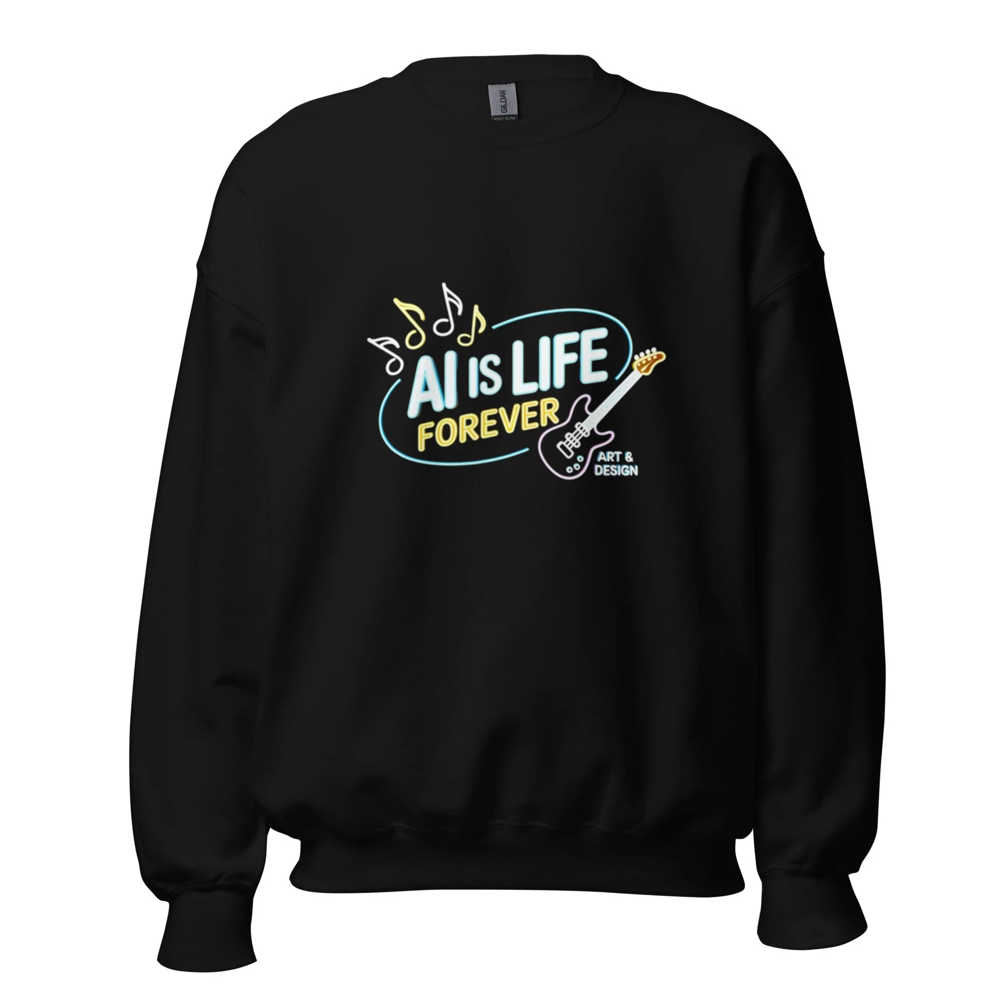Electric blue accents and a neon guitar motif bring a high-voltage musical energy to your wardrobe. This design is a loud, artistic celebration of the permanent impact of AI clothing. A sturdy and warm sweatshirt bound to keep you warm in the colder months. A pre-shrunk, classic fit sweater that’s made with air-jet spun yarn for a soft feel.