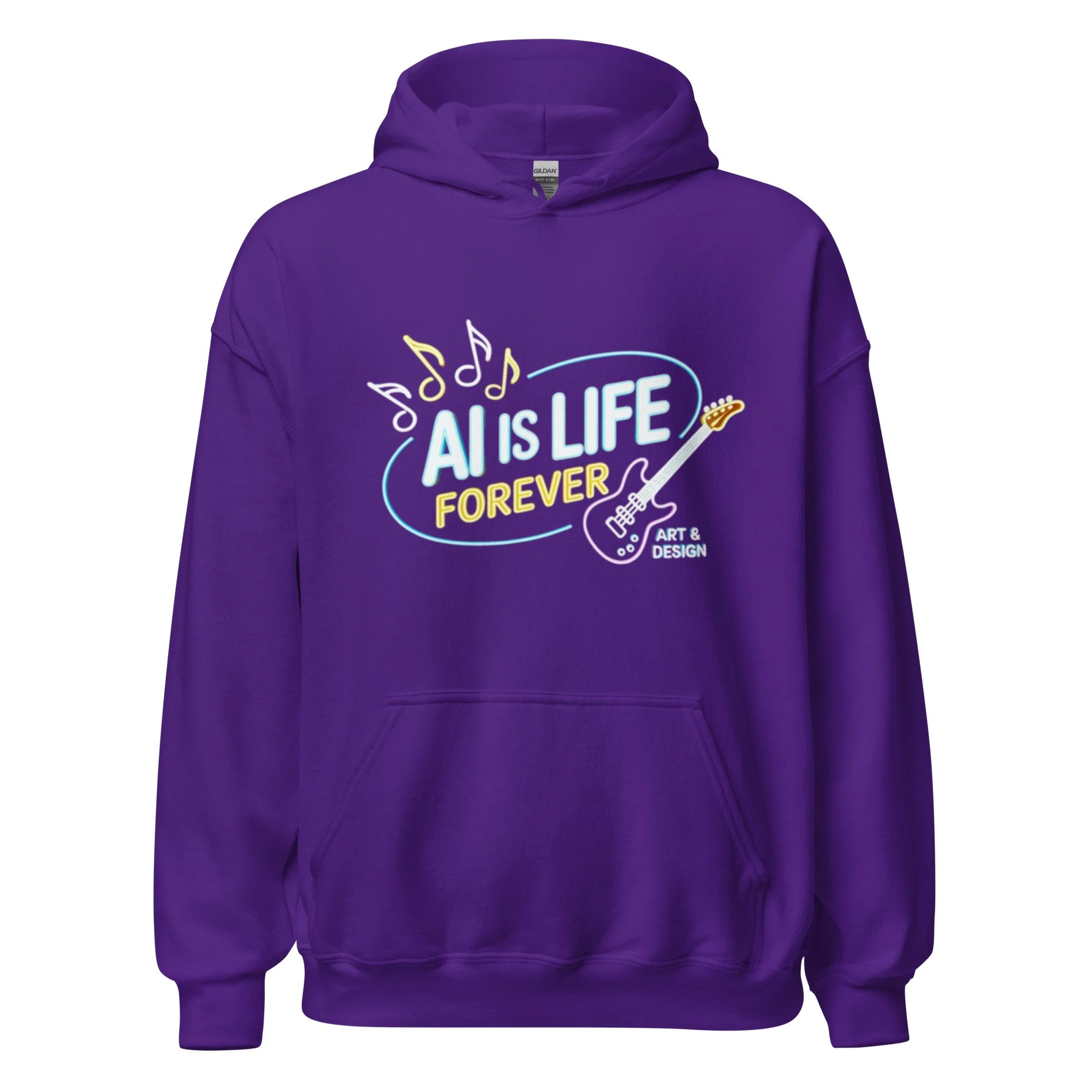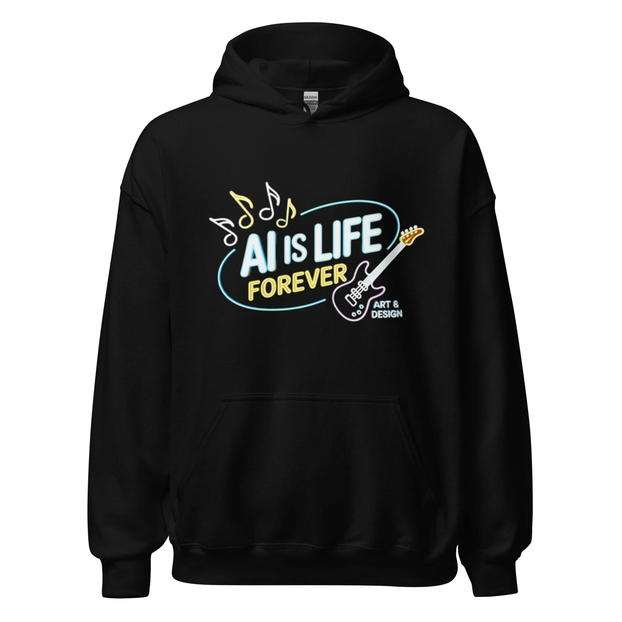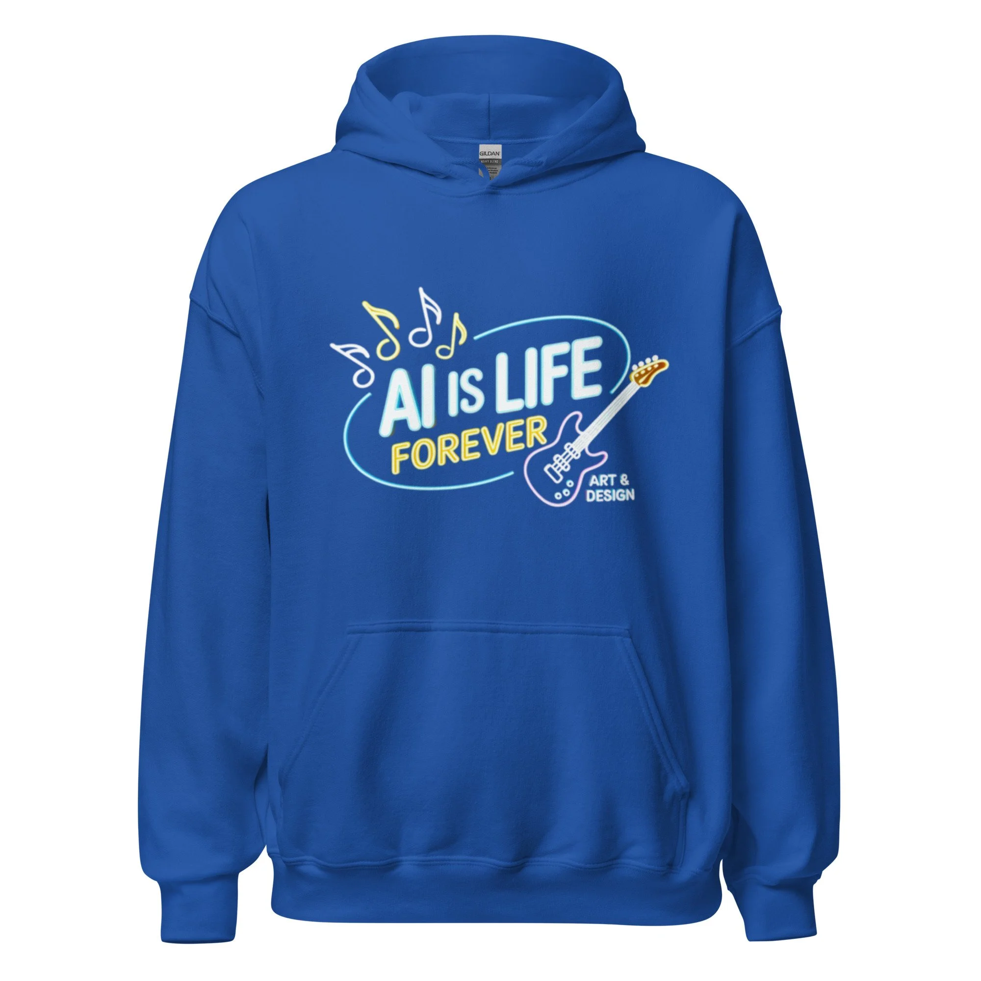 Electric blue accents and a neon guitar motif bring a high-voltage musical energy to your wardrobe. This design is a loud, artistic celebration of the permanent impact of AI clothing. Everyone needs a cozy go-to hoodie to curl up in, so go for one that's soft, smooth, and stylish. It's the perfect choice for cooler evenings!