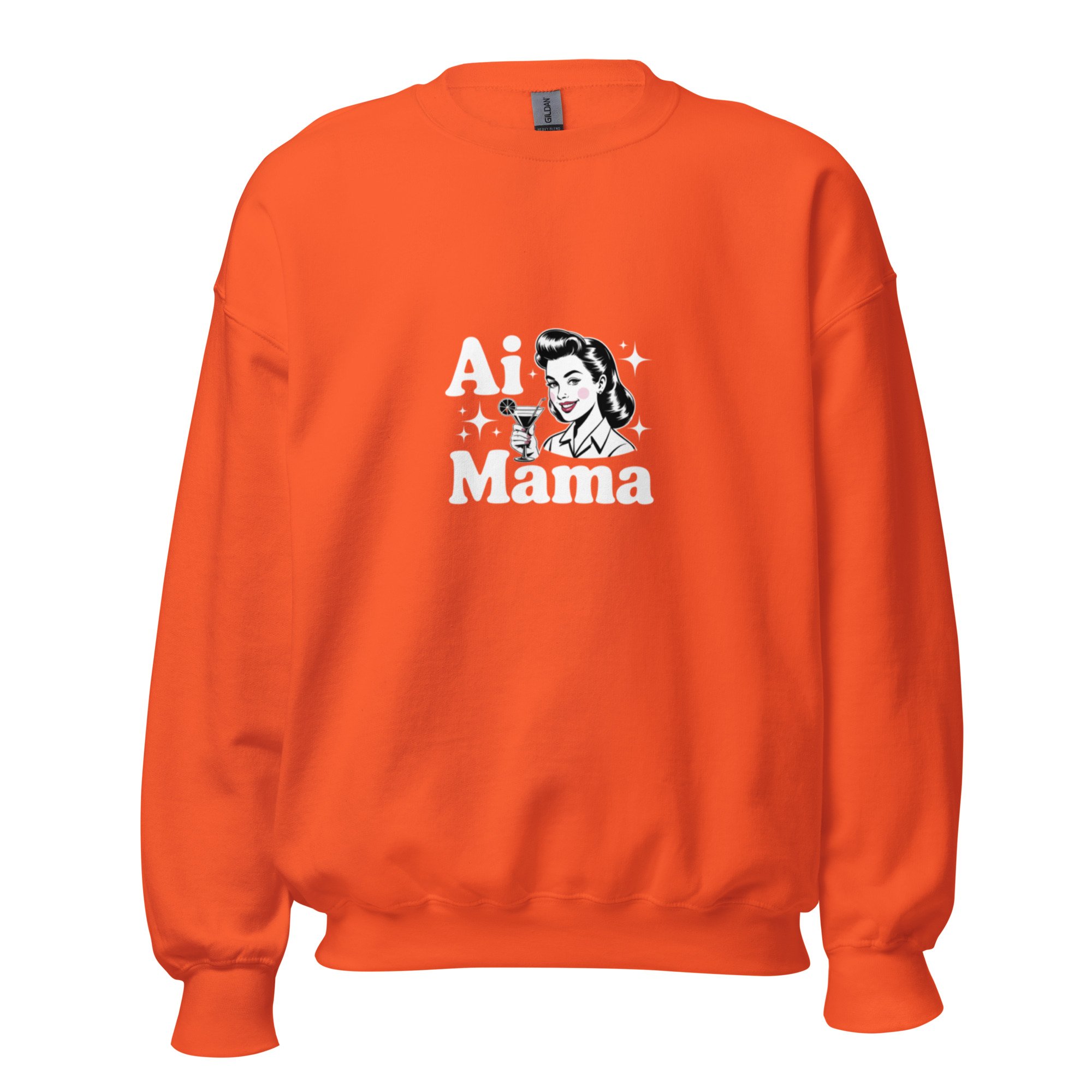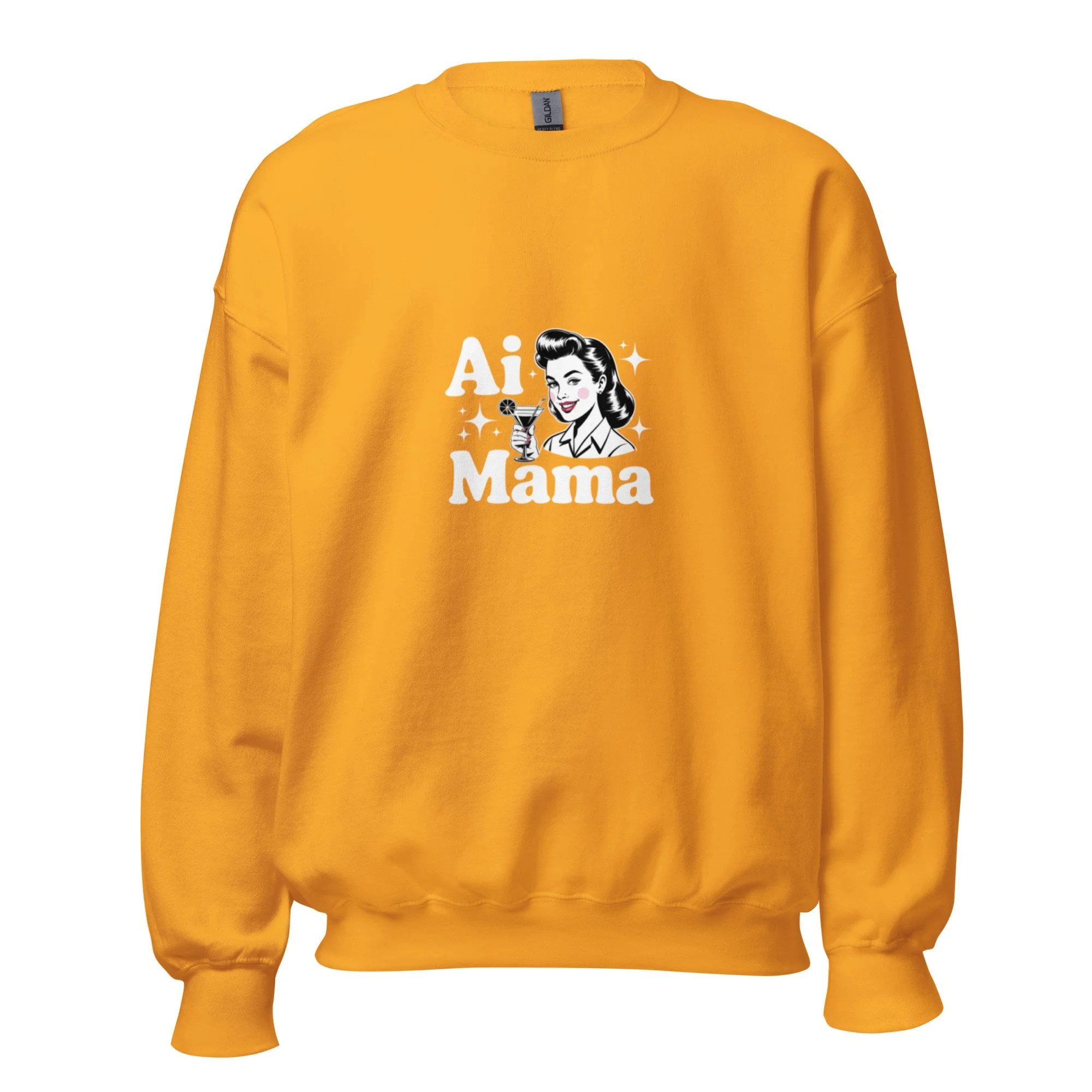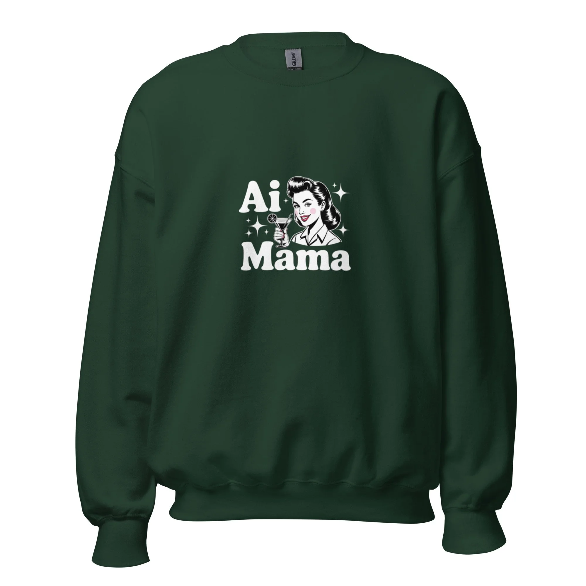 A classic mid-century pin-up aesthetic meets a sparkling digital era message. This "AI Mama" design offers a sophisticated and nostalgic take on modern tech identities. A sturdy and warm sweatshirt bound to keep you warm in the colder months. A pre-shrunk, classic fit sweater that’s made with air-jet spun yarn for a soft feel.