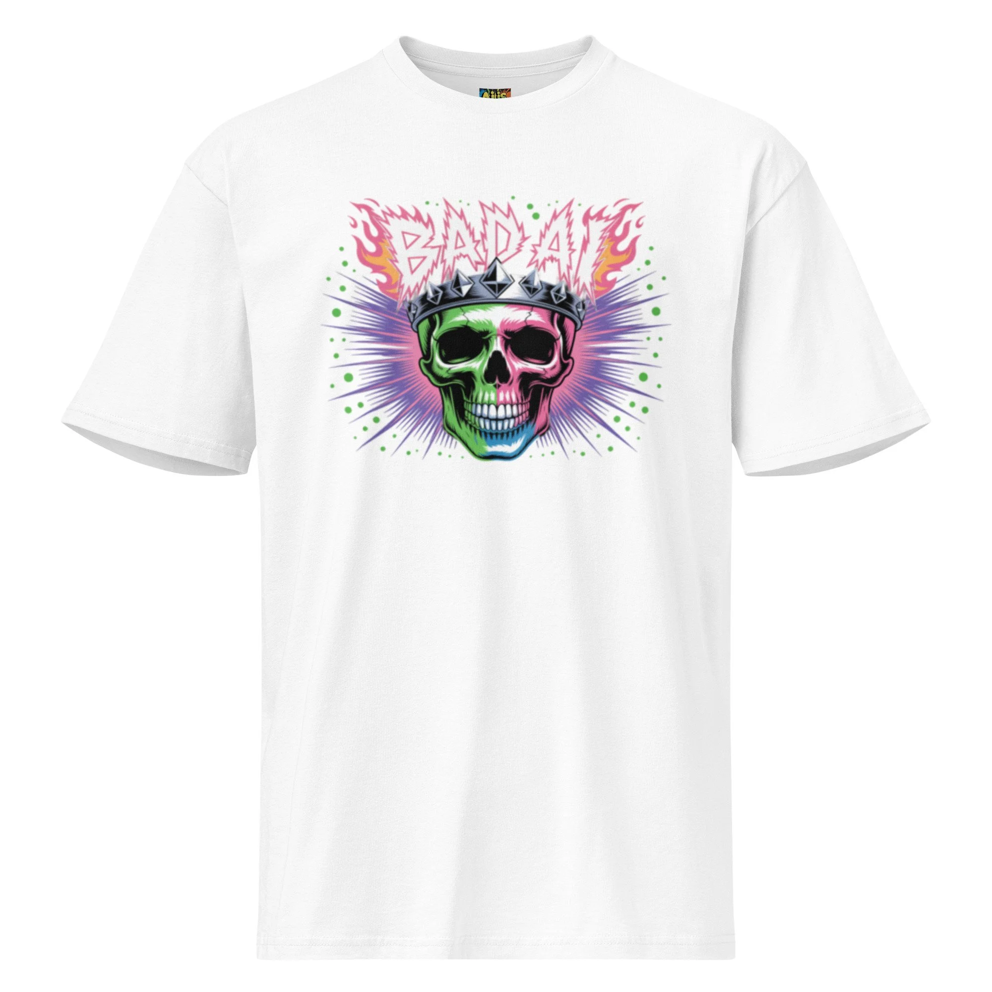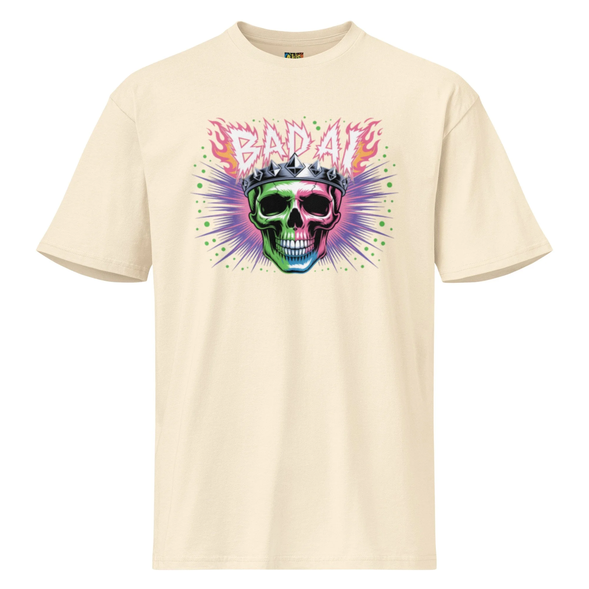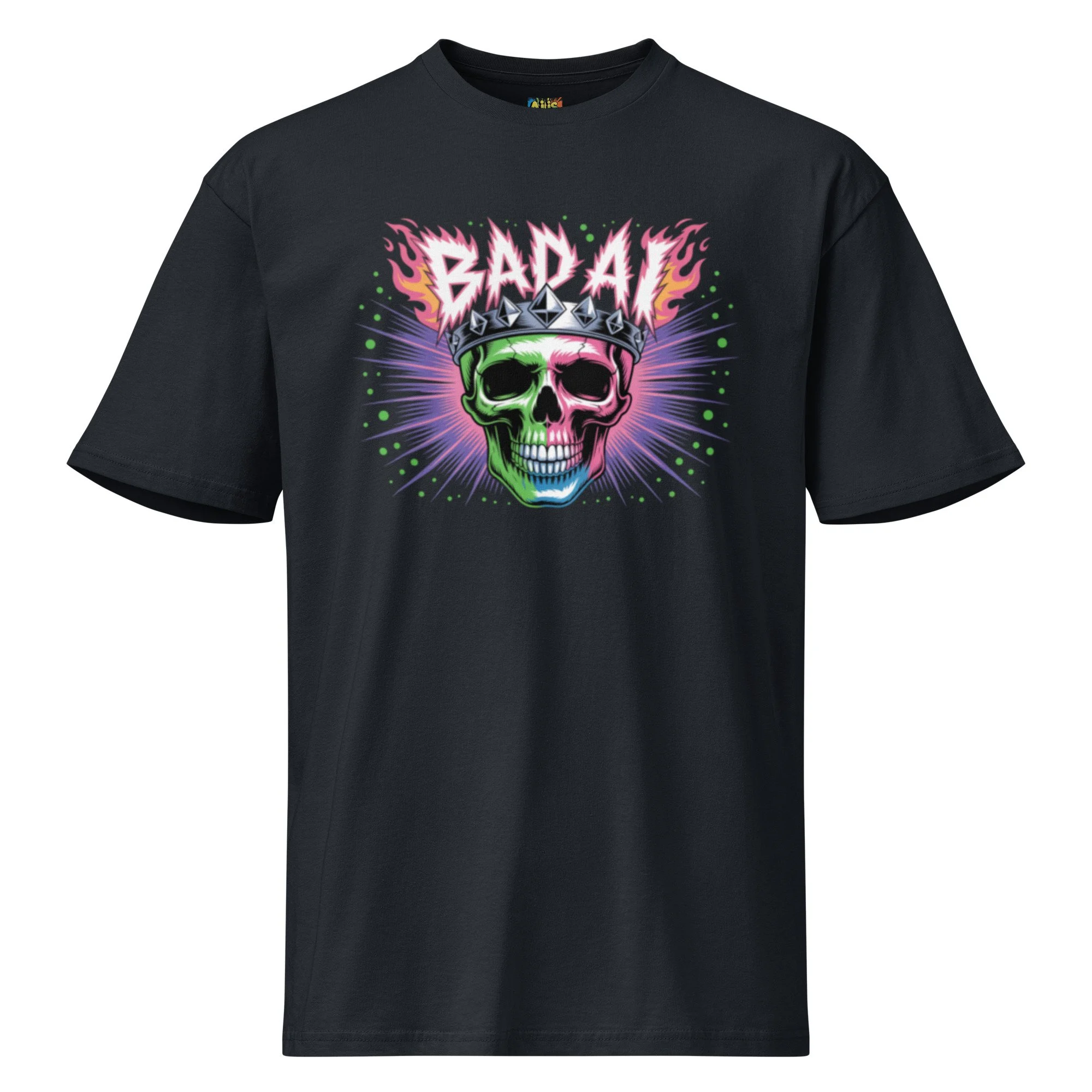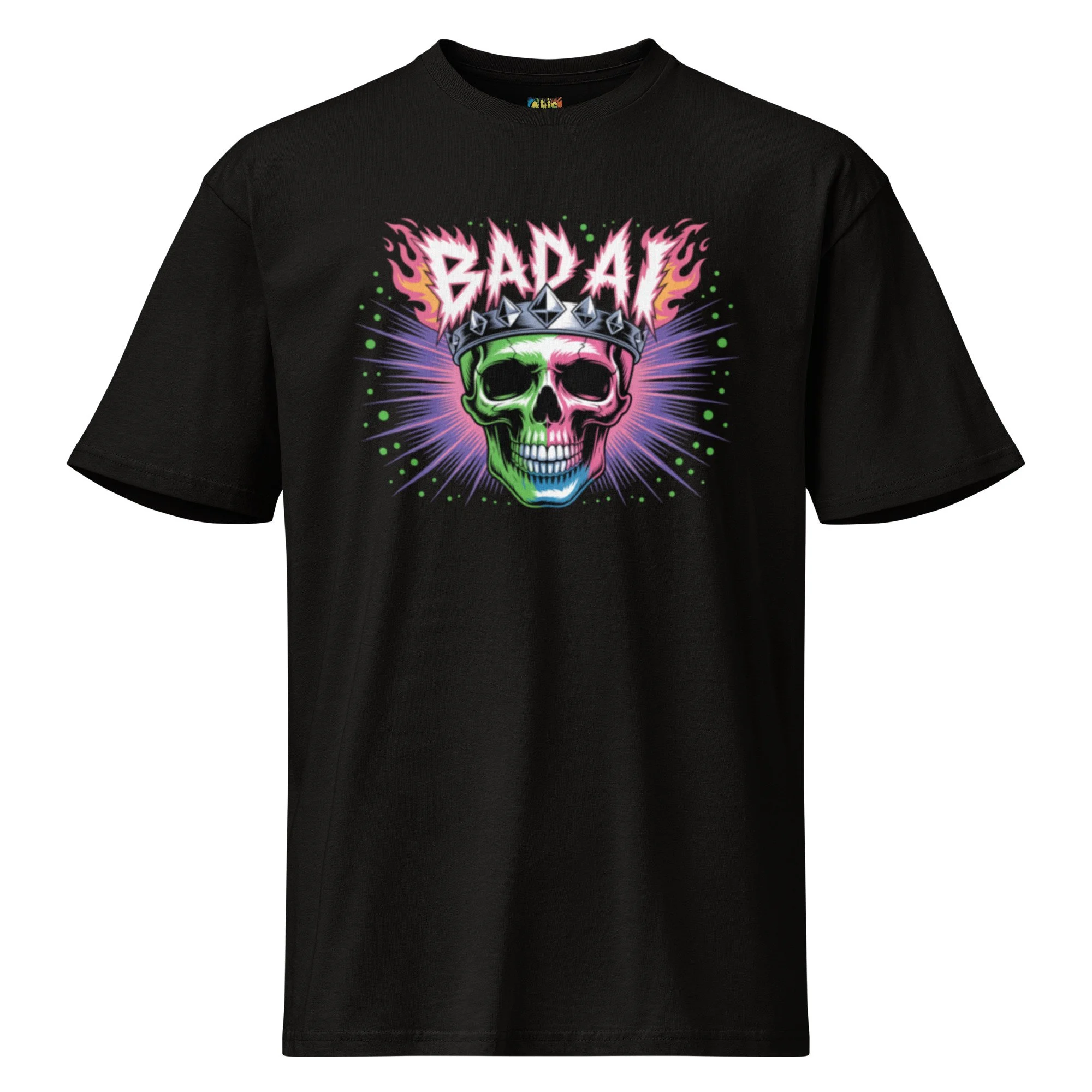 A neon-drenched skull wearing a spiked crown reigns over a digital explosion of green and purple. This high-voltage design is a centerpiece for any edgy AI clothing collection. Want a tee that balances premium comfort with everyday versatility? Men’s Premium Short Sleeve Tee delivers a clean, classic fit with a soft yet durable feel. Designed with a smooth surface and reinforced construction, it’s perfect for daily wear, layering, and high-quality prints, a reliable go-to you’ll reach for again and again.