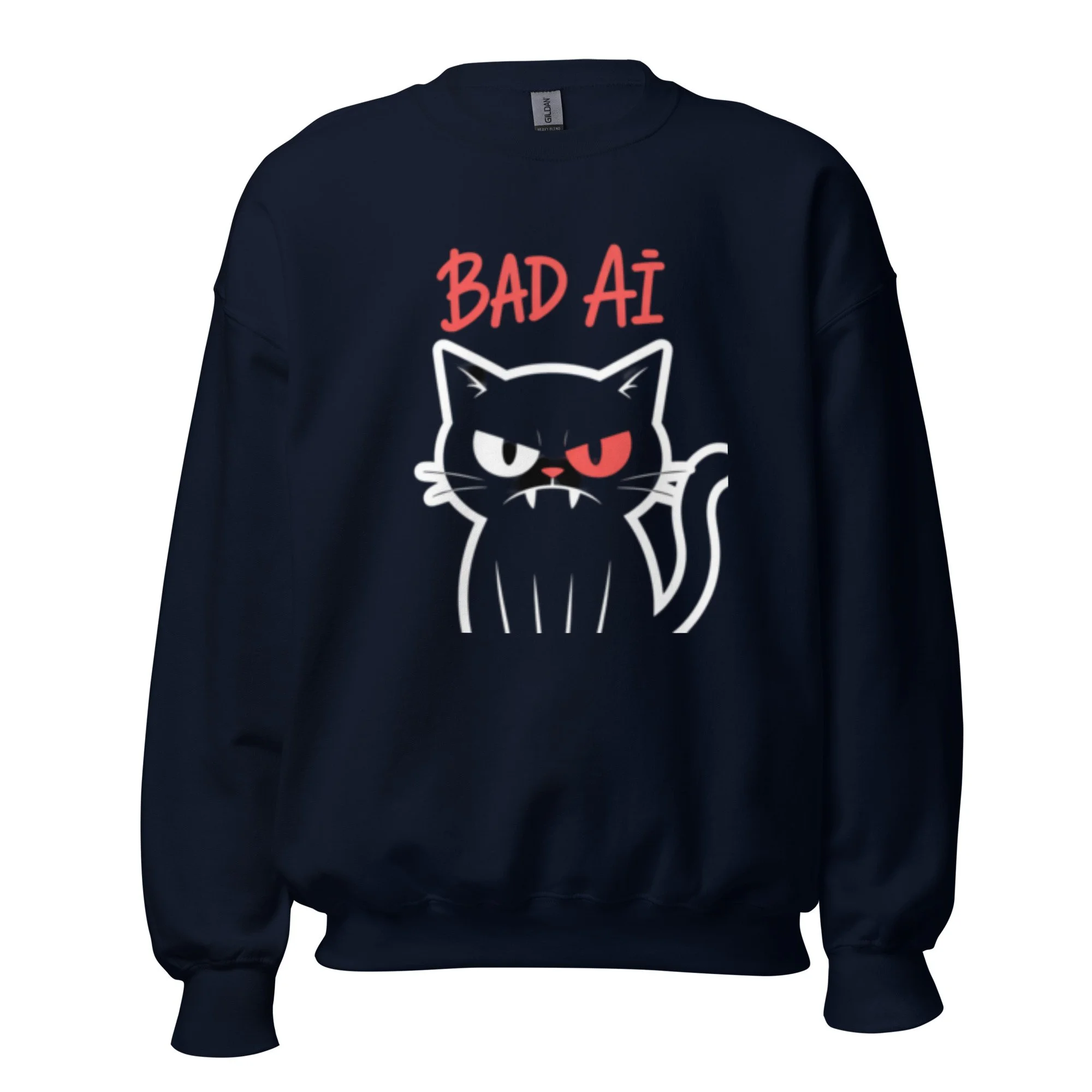 A rebellious feline with a cybernetic gaze defines this bold, high-contrast streetwear look. Make a statement with this edgy and playful addition to your AI clothing collection. A sturdy and warm sweatshirt bound to keep you warm in the colder months. A pre-shrunk, classic fit sweater that’s made with air-jet spun yarn for a soft feel.