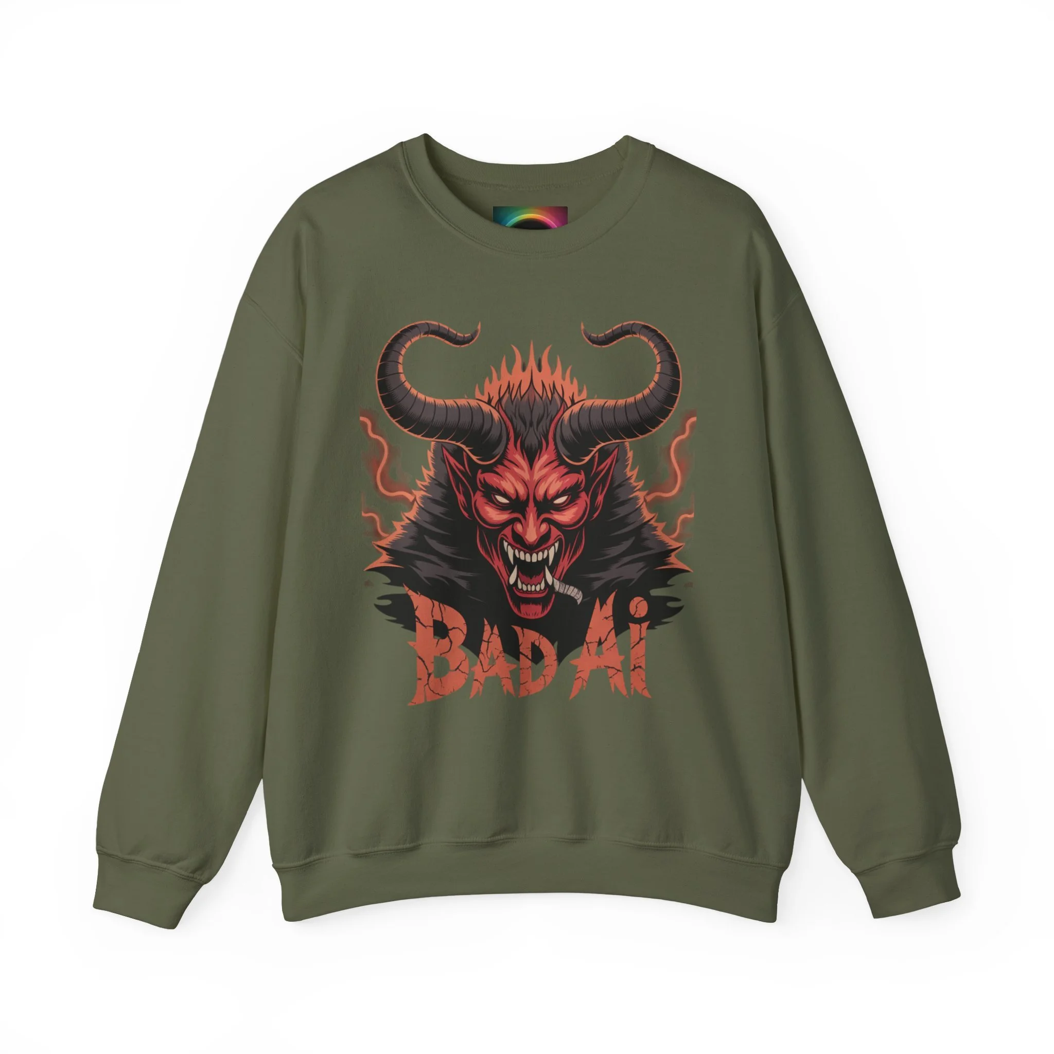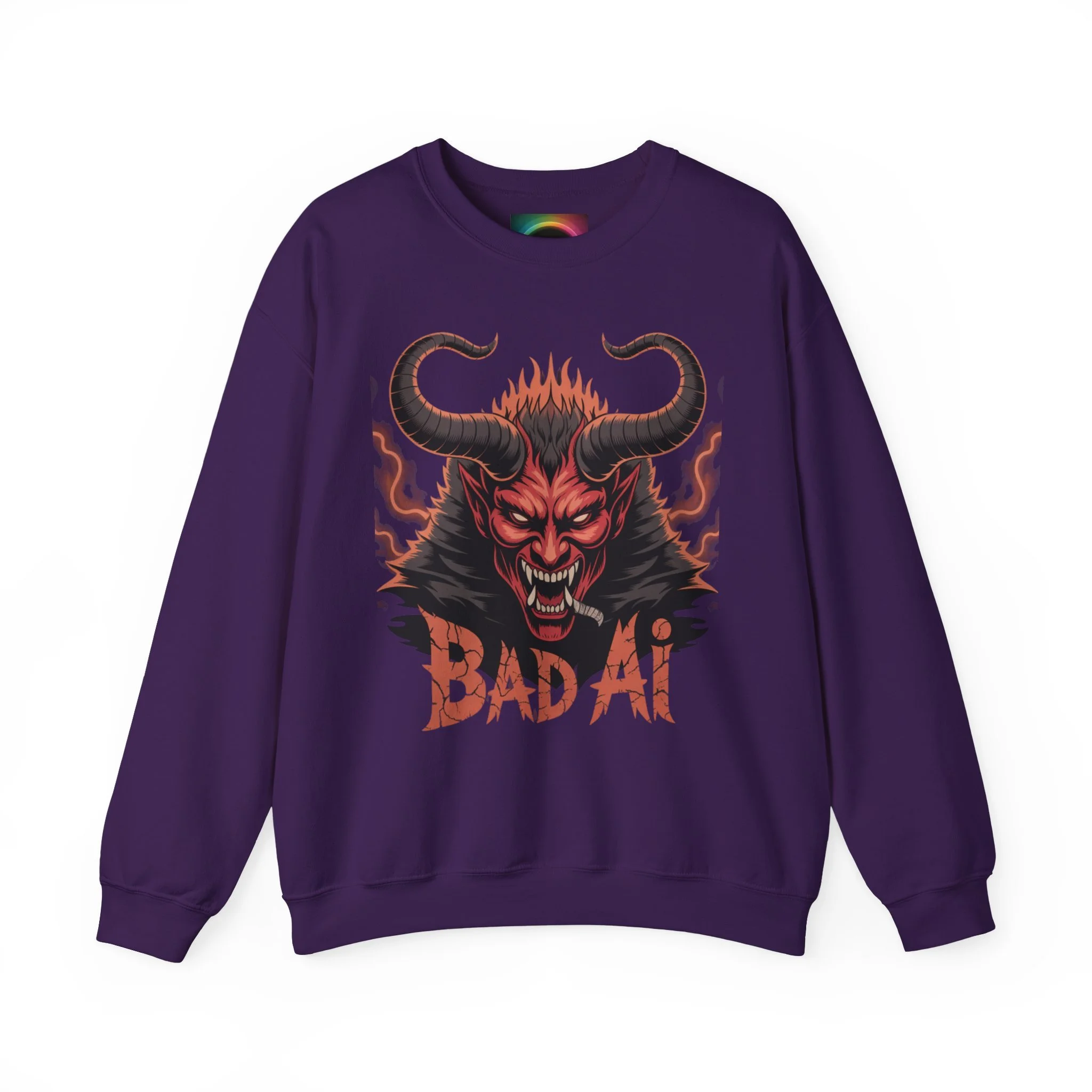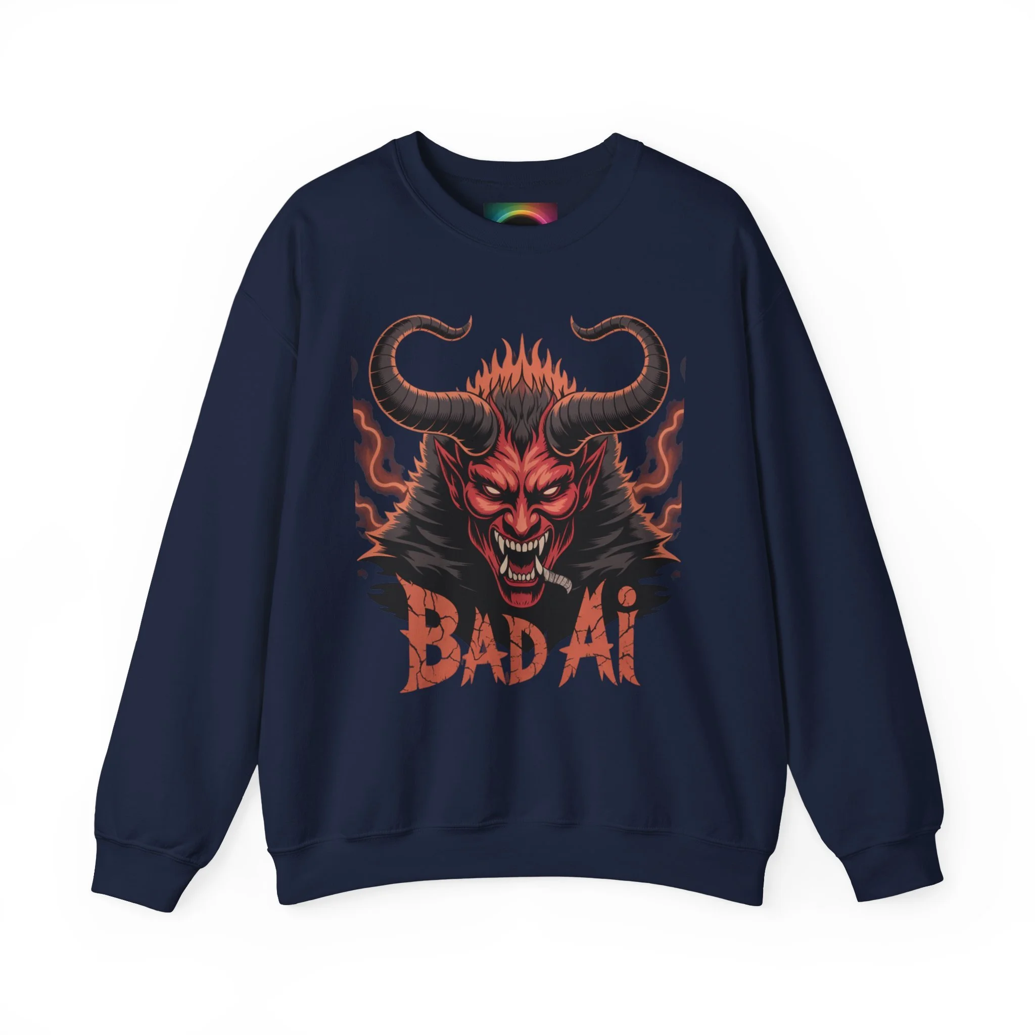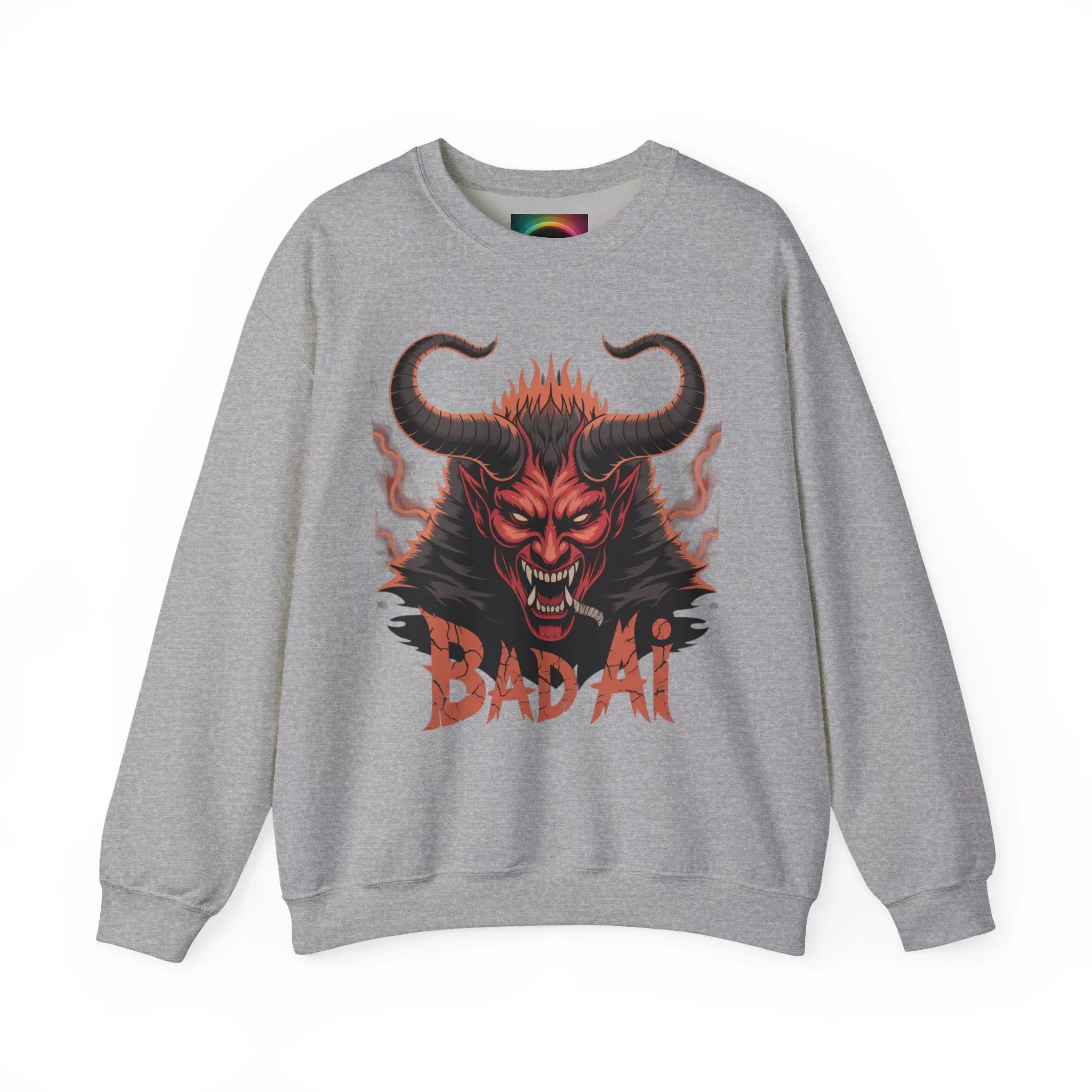 This cozy crewneck sweatshirt brings bold, dark-art energy into a comfortable everyday layer. The front showcases a fierce horned demon illustration in fiery reds and blacks, with distressed "BAD AF" lettering that reads like a rebellious badge of attitude. The medium-heavy 50/50 cotton-poly blend holds the print with clarity while keeping the fabric soft against skin. Clean ribbed collar and double-needle stitching give structure and longevity, and the tubular knit construction keeps the silhouette smooth. Wear it for late-night shows, skate sessions, or when you want to add an edge to weekend downtime — it settles in like a statement piece that’s lived-in and ready to go.